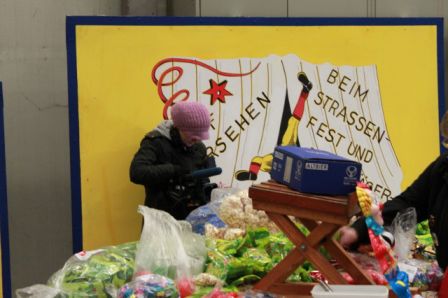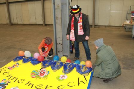 Endlich war es so weit. Karnevalssamstag fand das Richtfest der "Närrischen Bürgerhilfe" bei lausiger Kälte und angekündigtem Schnee statt. Vor dem Veedelszoch wurde der Wagen fertig gestellt. Die Platten mussten befestigt werden, die originellen Puppen aufgehängt werden, Luftballons wurden massenweise zum Dekorieren aufgepumpt und schließlich wurde der Wagen dekoriert. Zur Überraschung hatte sich tags zuvor center.tv angekündigt, filmte die stimmungsvolle Fertigstellung und begleitete am Karnevalssonntag unseren Wagen sogar. Alle waren mit Herz und Seele dabei. Zwischendurch stärkten sich die Teilnehmer bei der Kälte mit dem Düsseldorfer Nationalgetränk und hatten viel Spaß. Besonders freuten wir uns, dass uns Günther Hering noch Tipps für die Fertigstellung des Wagens geben konnte. Die Crew um Rainer Klöpper, die schon seit dem Sommer des letzten Jahres auf diesen Tag hinarbeitete, traf sich regelmäßig. Mehrere Frauen bastelten als Dekoration für den Wagen viele Puppen und waren dabei sehr kreativ und ideenreich. Es musste für das Motto "Jeck - we can" am Wagen selbst geschliffen, grundiert und gemalt werden. Dafür stellten Mitglieder und Freunde der B.H.G. ihre Freizeit zur Verfügung und verzichteten auf Ferien.
