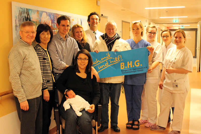 Emilia war 2013 das erste neugeborene Baby im Gerresheimer Krankenhaus. Beim Gruppenfoto zeigten die stolzen Eltern May und Daniel ihre Tochter Emilia. Hans Küster und Ratsfrau Angelika Penack-Bielor überraschten die Eltern mit einer Spende der Bürgerhilfe Gerresheim. Da strahlten auch die Großeltern. Für Dr. Taghavi, dem Chefarzt der Frauenklinik, und der Hebamme Cornelia Kramp ist das erste Baby eines Jahres immer etwas ganz Besonderes, wie man an den strahlenden Gesichtern von Schwester Jacqueline Hürng, Assistenzärztin Frau Dr. John und Schwester Juliane Bauer (von links nach rechts auf dem Bild) sieht.