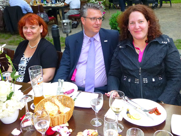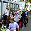 Während es auf dem Schützenplatz rege weiter ging, feierten geladene Gäste dann noch in der Trattoria Da Giacomo weiter. An Stelle von Geschenken bat Ute im Vornherein um eine Spende für die Bürgerhilfe Gerresheim. Hieran sieht man wieder, wie sozial Ute eingestellt ist, wie es unser Oberbürgermeister Dirk Elbers trefflich nachmittags schon sagte. Als Überraschung sang hier ein Chor der Gustav-Adolf-Gemeinde. Dadurch motiviert erzählte Ute Schulz einiges aus früheren Zeiten. Während der Menügänge stellte sie einige der Gäste vor, so zum Beispiel einige aus ihrer Branche, Einheimische wie Dr. Birken, Bäckerehepaar Schmalz oder Apothekerehepaar Herbort von der Rats-Apotheke. Ralph Marquis, begleitet von seiner Frau, brachte nach dem Essen ein Ständchen und sang Düsseldorfer Lieder. Anschließend wurde den beiden Geburtstagskindern, darunter Giacomo selbst, musikalisch unter Wunderkerzen gratuliert. Hans Küster, Dr. Petersen mit Frau und Ehepaar Brück, stellvertretend für die Bürgerhilfe, waren bei angenehmen Temperaturen wie alle Gäste begeistert von der Atmosphäre. Kevin Küster und seine Freundin brachten gegen Ende des Abends noch ein Trompetenständchen dar. Die Angestellten von Ute Schulz hatten sich noch eine Überraschung für Ute ausgedacht. Joachim Heik und Alfred Schulz brachten zwischendurch immer wieder musikalische Einlagen. Zum Schluss gilt es nochmals Ute Schulz danke zu sagen für den Tag, ihren Einsatz für die Bürgerhilfe Gerresheim und den Stadtteil.