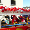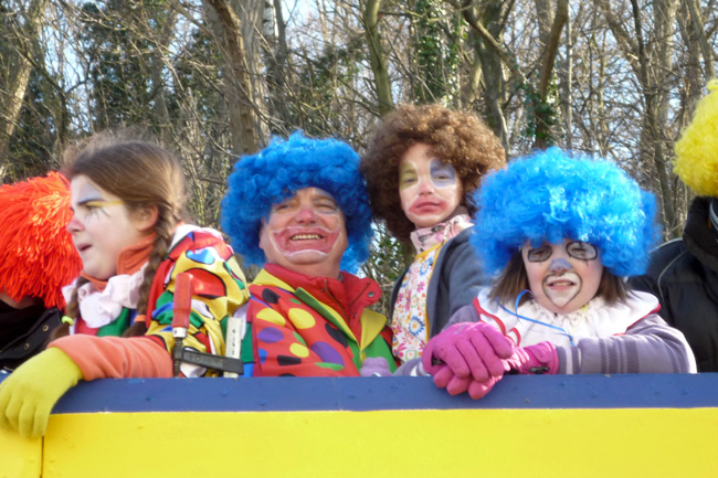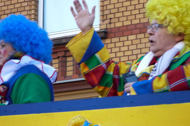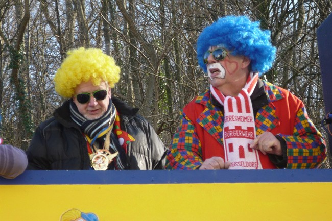 Wie es schon Tradition ist, fuhren die Wagen an allen übrigen vorbei, so dass jeder Teilnehmer am Zug auch die anderen Wagen sehen konnte, eine gute Idee. Ãber die Morper Straße und Heyestraße ging es am Quadenhof vorbei über Kölner Tor, wo alle Gruppen begrüßt wurden, Richtung Gerresheimer Rathaus. Die Fußgängerzone war ein reines Menschenmeer, wo alle begeistert jubelten. Nicht nur die Kids sammelten fleißig Wurfmaterial und ließen ihren Charme spielen. Gruppen hatten sich originell verkleidet wie zum Beispiel in Froschkostümen. Einige Gruppen sah man um Bierfässer versammelt. Weiter ging es über die Benderstraße, dann über die Von-Gahlen-Straße bzw. Unter den Eichen, dann weiter bis zum Quadenhof, wo sich der Zug auflöste. Die Stimmung war toll. Danach wurde meist in den Gaststätten oder privat weitergefeiert. Die Stimmung war einmalig, wie die Bilder, die ich vom Wagen der Bürgerhilfe Gerresheim gemacht habe, deutlich dokumentieren. Der Großteil der jecken Bürgerhilfe ging zu KlostermannÂs, die sich sehr viel Mühe gemacht haben und kurzfristig eingesprungen sind. Es muss dort, wie ich hörte, wie immer ein ganz toller Nachmittag gewesen sein. Ein Riesenkompliment und Dank an die Klostermanns!