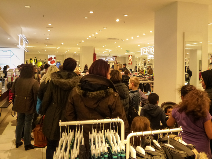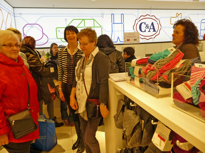 Danach zogen alle mit Spielzeugen und Ballons zur Einkleidung nach C&A. Anfangs kam es etwas zum Gedränge, da jeder Name kontrolliert werden musste und jedes der 28 Kinder einen Anhänger für die Zeit des Aussuchens bekam. Diese Aktion wurde von der Deutschen Bank unterstützt. Heinz Lückerath, dessen Filialdirektor von der Benderstraße, kannte das Procedere schon. Beate Schwinges von der Stiftung Düsseldorf/ Niederrhein der Deutschen Bank und auf der Königsallee aktiv kannte diese Aktion nur vom Hören und Sagen und erlebte einen interessanten Nachmittag, den sie von Anfang an mit McDonald's beginnend miterlebte. Die Bürgerhilfe Gerresheim und die Helfer legten großen Wert darauf, dass sich jedes Kind seine Wunschkleidung für jeweils 100 Euro selbst aussuchte und Zeit dafür nahm. Anschließend zeigten mehrere Kids stolz, was sie ausgewählt hatten, um warm durch den Winter zu kommen, und bedankten sich bei verschiedenen Mitgliedern der Bürgerhilfe. Sicherlich muss bei jeder Einkleidung eine Auswahl getroffen werden, dabei müssen unterschiedliche Gesichtspunkte berücksichtigt werden, damit möglich viele der in Betracht kommenden Familien berücksichtigt werden können. Dank gilt an dieser Stelle den edlen Spendern und Helfern, was keine Selbstverständlichkeit ist.