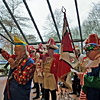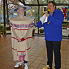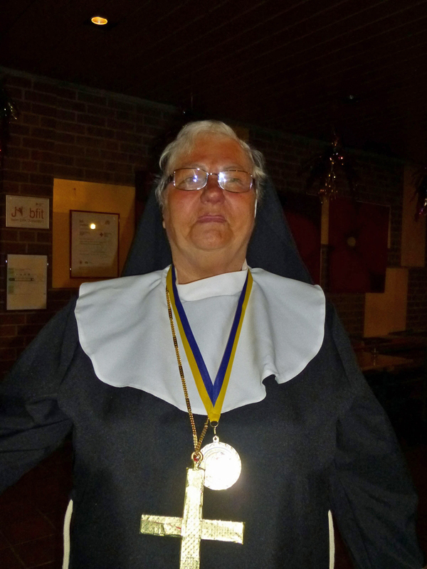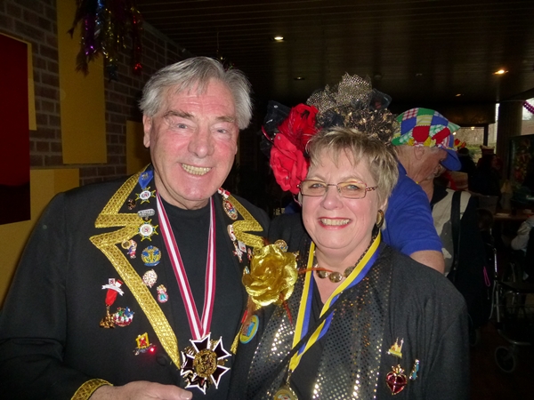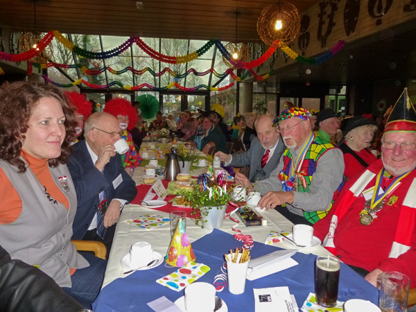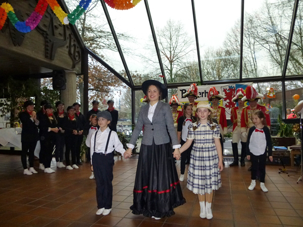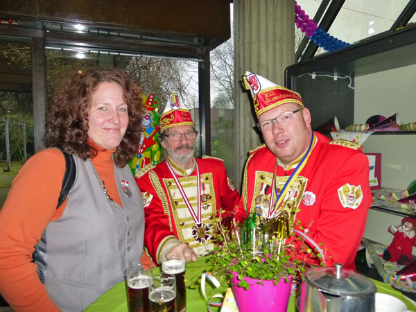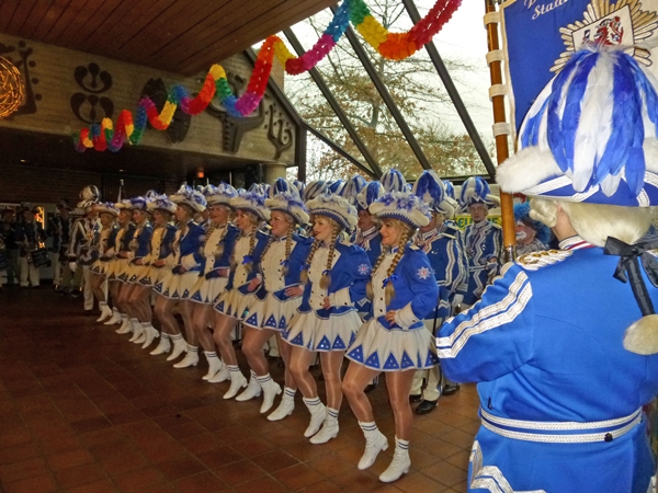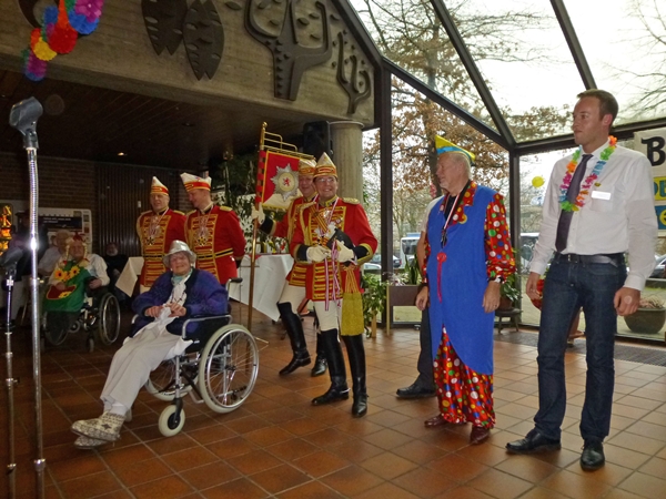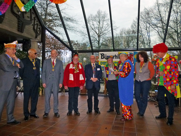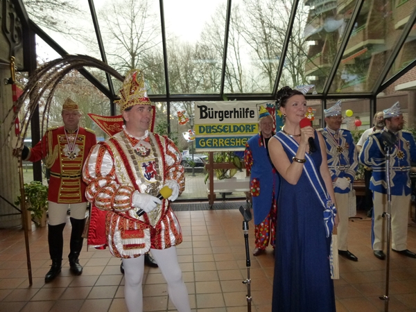 Ein weiterer Höhepunkt war natürlich das Düsseldorfer Prinzenpaar, Prinz Michael I. und seine Venetia Pia, das mit ihren Adjutanten gekommen war. Das Prinzenpaar nahm sich Zeit, erzählte, sang, ging durch die Reihen, verteilte Orden und nahm die 107jährige Seniorin in ihre Mitte, wobei deren Augen strahlten. Hans Küster, der erste Vorsitzende der Bürgerhilfe Gerresheim, der diese Sitzung zusammengestellt hatte, war ebenso begeistert wie sein Sohn, der moderierte, und die 3 Enkel, welche die Ordensverteilung übernahmen. Anschließend marschierte Blau Weiß, die Leibgarde unserer Venetia, mit voller Mannschaft auf und begeisterten mit Gesang, Tanz und anderen Aktionen, unterstützt von deren Trompetern und sonstigen Musikern, die aus Platzmangel an der Seite standen. Allein deren Ein- und Auszug war eine Augenweide.