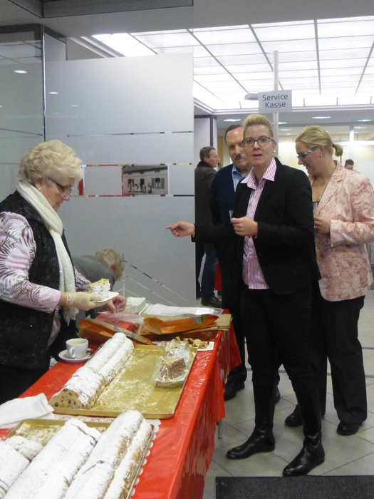 In der Filiale der Stadtsparkasse Düsseldorf auf der Benderstraße strahlten die Geschäftsstellenleiterin Melanie Günther und Filialdirektor Lütfü Sine am Montag, dem 1. Dezember 2014, als bei der Aktion mit der Bürgerhilfe Gerresheim etwa 6 Meter Christstollen verkauft wurden, der von der Bäckerei Schrade für den guten Zweck gespendet wurde. Der aufgereihte Anblick der Stollen um 9.30 Uhr war eine Augenweide - Stollen, so weit das Auge reichte. Diese Aktion in der Filiale hat mittlerweile schon Tradition. Prominente wie der ehemalige Stadionsprecher Dieter Bierbaum halfen beim Verkauf sehr aktiv und förderten so den Umsatz, wie es neben den Helfern der Bürgerhilfe Gerresheim auch weitere Prominente wie der Bezirksbürgermeister Karsten Kunert, Ratsfrau Angelika Penack-Bielor oder Andreas Preuß vom Tischtennisverein Borussia Düsseldorf taten. Toll war, dass auch unsere Düsseldorfer Bürgermeisterin Klaudia Zepuntke den Verkauf tatkräftig unterstützte. Die Aktion war ein großer Erfolg. Dank gilt an dieser Stelle den Helfern und dem edlen Spender. Hans Küster, der erste Vorsitzende der Bürgerhilfe Gerresheim kann sich freuen, denn der gesamte Erlös kommt wie immer den sozialen Anliegen der Bürgerhilfe Gerresheim zugute.
