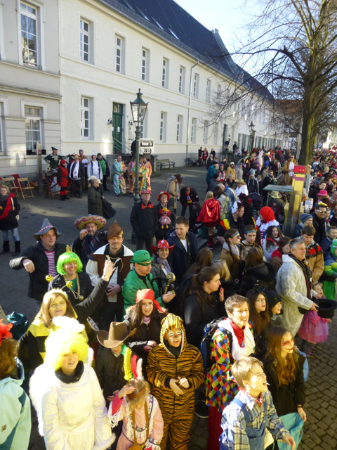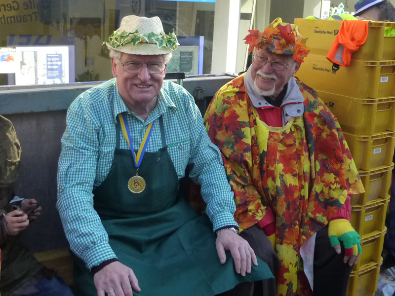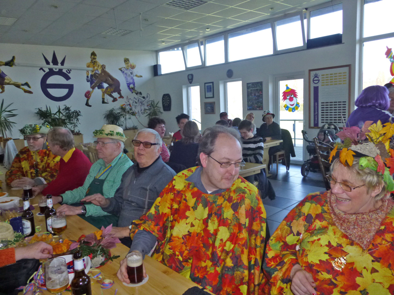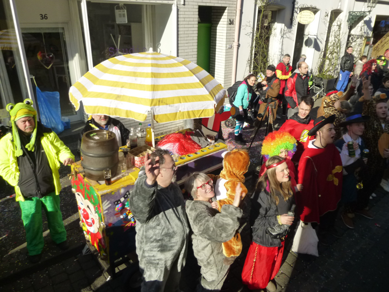 Die Restaurants und Kneipen wurden von den meisten Zuschauern nach dem Zoch angesteuert. Dort wurde zum Teil bis in den späten Abend dicht gedrängt gefeiert, nachmittags bei dem Superwetter auch draußen. Unsere Gruppe saß nach dem Zoch im Vereinshaus vom TUS zusammen. Allerdings stießen die fleißigen Mitglieder, die den Wagen abbauten, 2 Stunden später dazu.
