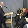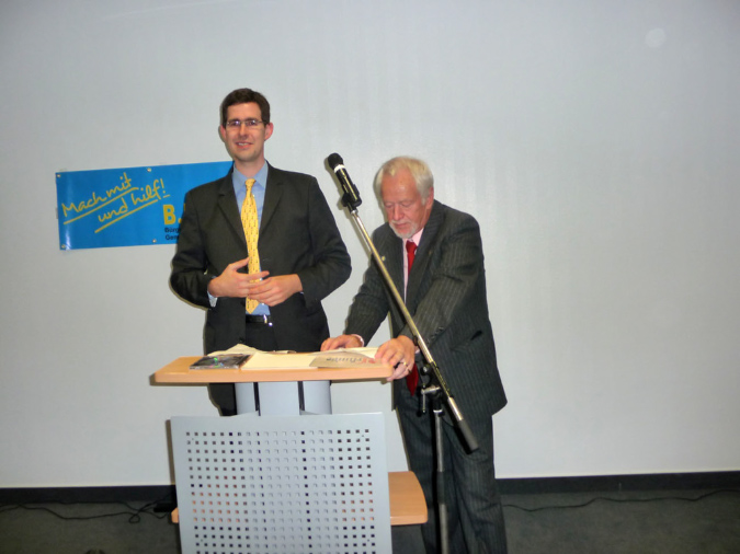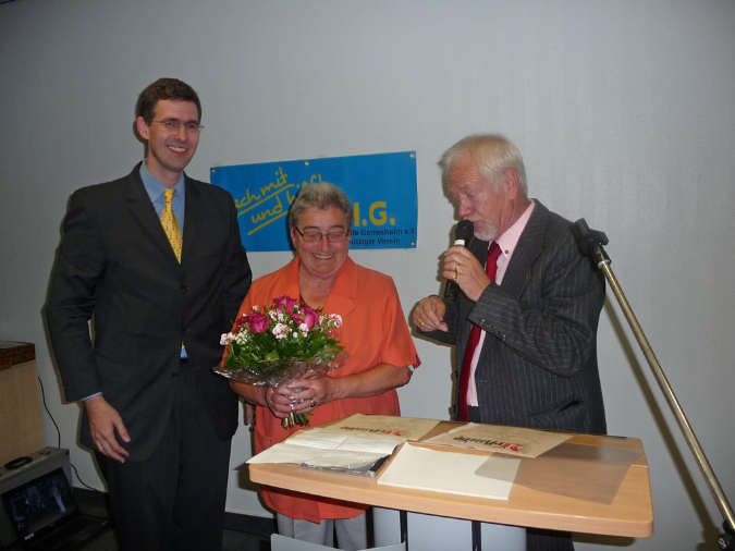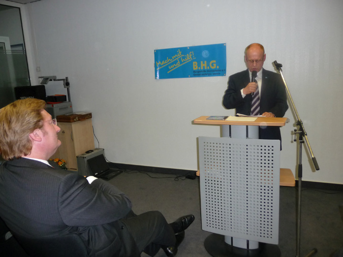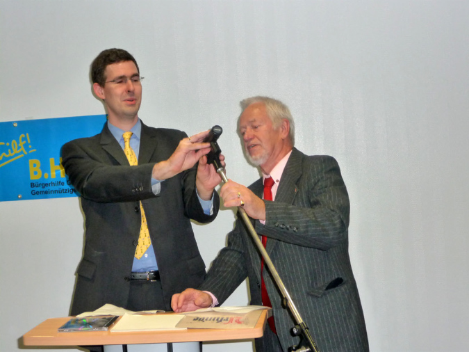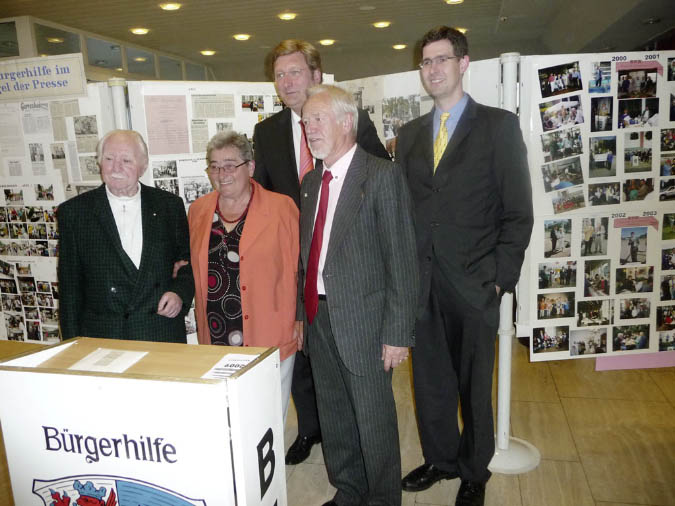 Hanno Bremer, Bezirksvorsteher im Stadtbezirk 7, machte in seinem Erfahrungsbericht aus Sicht des Bezirksbürgermeisters bewusst, wie wichtig die Arbeit der Bürgerhilfe für Gerresheim ist, erzählte von persönlichen Erlebnissen mit Hans Küster und seiner unnachahmlichen Art, auf Menschen zuzugehen. Noch im letzten Dezember hatte die Bezirksvertretung für die Bürgerhilfe bei nasskaltem Wetter auf der Straße gesammelt. Man hatte es gern gemacht, weil das Geld bedürftigen Menschen im Stadtteil zu Gute kommt. Anschließend gab es einen Rückblick der besonderen Art. Der zweite Vorsitzende Dr. Jens Petersen interviewte den ersten Vorsitzenden Hans Küster sehr originell. Dieser erzählte, wie es zur Gründung der Bürgerhilfe vor 20 Jahren in der Kleingartenanlage im Brühl kam, weil man einer hilfsbedürftigen Familie helfen wollte, und wie sich alles, mit dem Christstollenverkauf beginnend, entwickelte. Hans Küster konnte Joachim Erwin als hunderstes Mitglied gewinnen. Er fand Anerkennung für ihn, weil dieser, obwohl sehr krank, sehr viel für die Bürgerhilfe tat. Heute hat diese fast 400 Mitglieder. Seit ihrer Gründung ist die Bürgerhilfe jedes Jahr zu Karnevalsveranstaltungen im Ferdinandheim aufgetreten, seit einigen Jahren auch im DRK-Heim. Die Bedeutung des Straßenfestes mit dem traditionellen Radschägerturnier nahm von Jahr zu Jahr zu und dieses Fest ist heute die Haupteinahmequelle des Vereins. Bei jedem Wetter fand der Christstollenverkauf statt und der Weihnachtsbasar im Krankenhaus wurde zur Tradition. Jede Spende, ob groß oder klein, ist wichtig für den Verein, um spontan individuell Menschen in Notsituationen zu helfen. Die Bürgerhilfe tut viel für Senioren und Jugendliche. Vieles passiert im Stillen. Jeder Gerresheimer konnte sich an die Bürgerhilfe wenden und um Hilfe bitten, sei es finanzieller oder ideeller Art. Stellvertretend für die Mitglieder der Bürgerhilfe würdigte der Vorsitzende dann Hans Klostermann, der sich um die Technik kümmerte, Manfred Bracken, der die Straßenfeste organisierte und Rosi Theiß, die sich als langjährige zweite Vorsitzende für den Verein einsetzte und viel für die Bürgerhilfe geleistet hat. An dieser Stelle möchte sich der Vorstand bei den vielen ungenannten Mitgliedern bedanken, ohne deren unermüdlichen Einsatz das alles nicht möglich gewesen wäre.