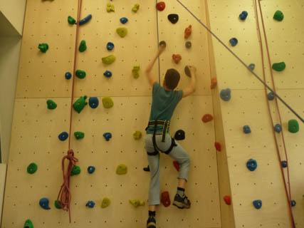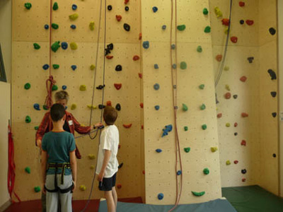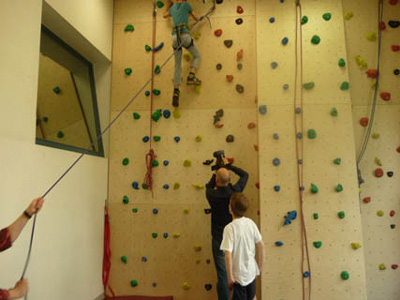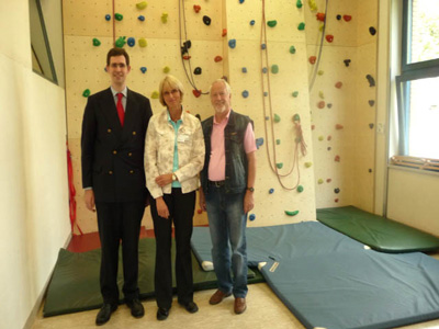 Dr. Jens Petersen (links) und Hans Küster (rechts) übergaben im Namen der Bürgerhilfe Gerresheim offiziell die neue Kletterwand an Frau Dr. Weise (Mitte), der Chefärztin in der Neuropädiatrie des Kinderneurologischen Zentrums des Krankenhauses Gerresheim.