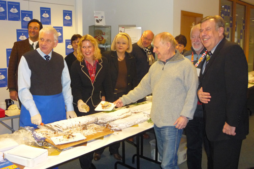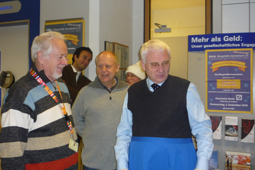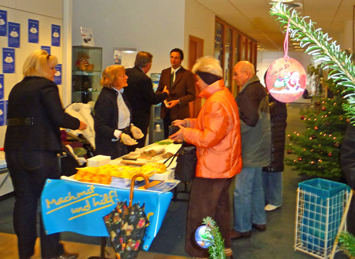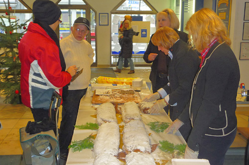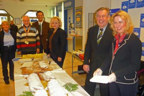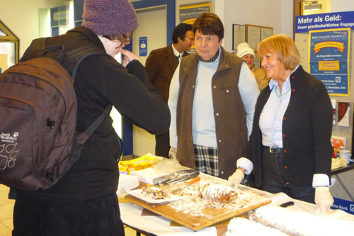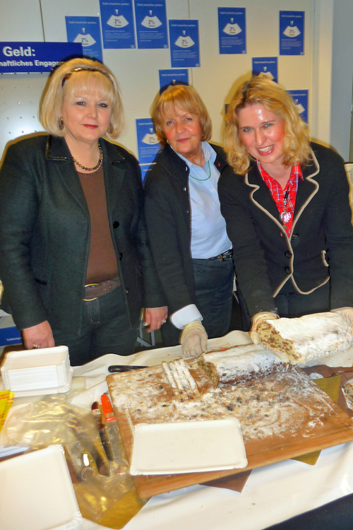 Die diesjährige Christstollenaktion der Bürgerhilfe Gerresheim fand am Donnerstag, dem 2. Dezember erstmalig in der Deutschen Bank an der Benderstraße statt. Deren Leiter, der Ehrenmedaillenträger Heinz Lückerath, Frau Penack-Bielor aus dem Stadtrat, Dr. Kourosh Taghavi, Chefarzt der Abteilung Frauenheilkunde und Geburtshilfe und viel Prominenz nahm sich die Zeit, den riesenlangen Christstollen zu verkaufen. Danke für das Engagement! Der Erlös ist in diesem Jahr ebenso wie der bei den Weihnachtsbasaren der Bürgerhilfe Gerresheim für die Geburtsstation der Sana-Klinik des Gerresheimer Krankenhauses bestimmt. Dank gilt in besonderer Weise dem engagierten Bäckermeister Schmalz, der den über 22 Meter langen, qualitativ hervorragenden Christstollen gebacken hatte und für diesen guten Zweck wie im letzten Jahr spendete. Im Vergleich zu 2009 waren alle Helfer froh, dass sie diesmal nicht in der „Saukälte“, sondern in der Wärme standen. Obwohl morgens kräftiger Schneefall einsetzte, war schon bis mittags zwei Drittel des Stollens verkauft. Hans Küster, der erste Vorsitzende der Bürgerhilfe Gerresheim, die Mitarbeiter der Deutschen Bank und alle Aktiven freuten sich über den Riesenerfolg dieser Aktion.
