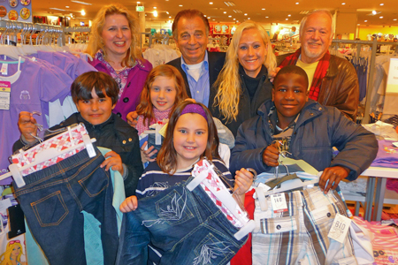 Bild 2 : Von links: Frau Penack-Bielor, Herr Enrico de Angelis, Frau Crosier, Herr Hans Küster und 4 Kinder, die ihre Wunschkleidung ausgesucht haben.