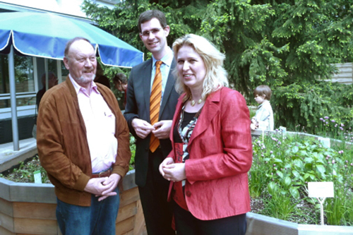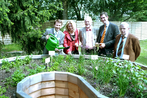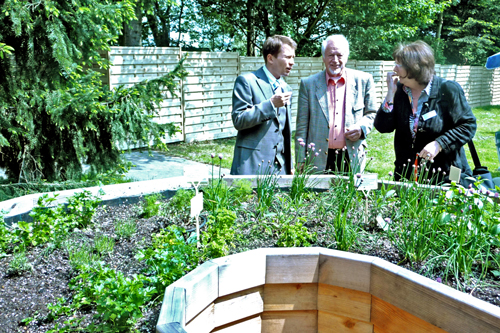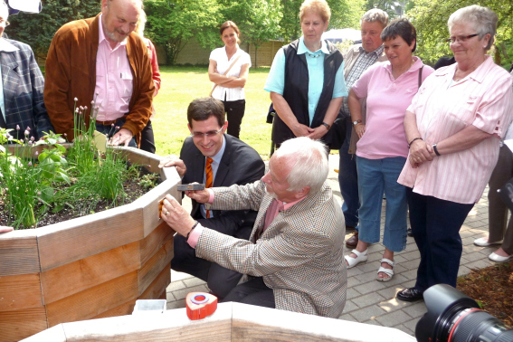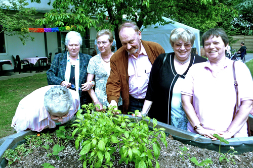 Wie Dr. Supprian den zahlreich erschienenen Mitgliedern der B.H.G. und anderen Gästen erläuterte, erweitert Gartenarbeit das therapeutische Spektrum bei Demenzerkrankungen zu allen Jahreszeiten. Die Arbeit im Garten ist sehr abwechslungsreich und wirkt unmittelbar auf die Sinne. Die Bewegung fördert die Koordination und den Gleichgewichtssinn. Blüten und Blätter strömen Düfte aus, versprechen Geschmackserlebnisse und wecken alte Erinnerungen. Gehbehinderte können sich an diesen Hochbeeten abstützen und brauchen sich nicht zu bücken. Bei vielen depressiv Erkrankten sind die an den Hochbeeten gesammelten Sinneseindrücke die ersten intensiven Erfahrungen nach langen Krankheitsphasen. Bei Demenzkranken bilden sie eine Brücke zu alten Erinnerungen bis hin zur Kindheit. Insgesamt unterstützen die Empfindungen die ergotherapeutischen und kreativtherapeutischen Behandlungen der Patienten.
