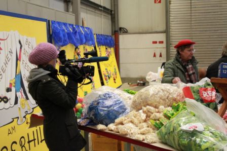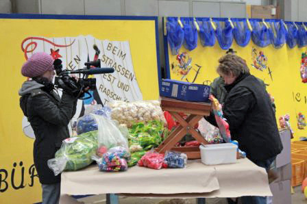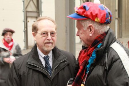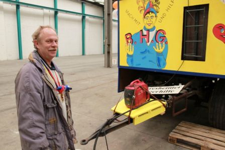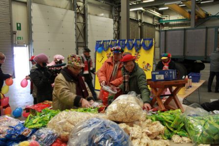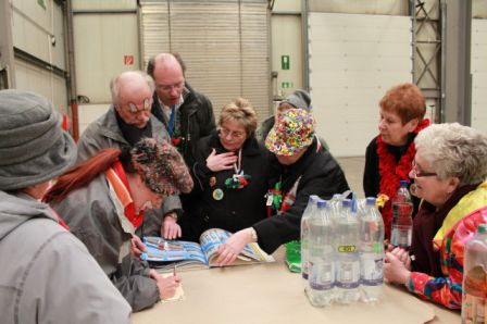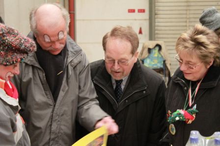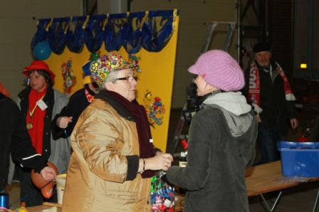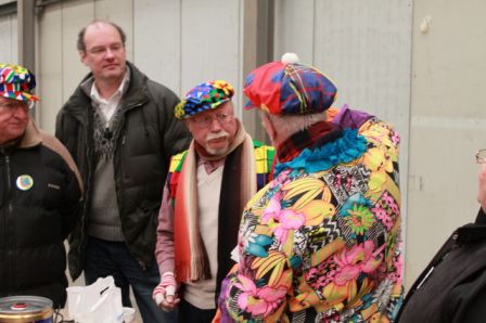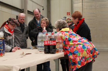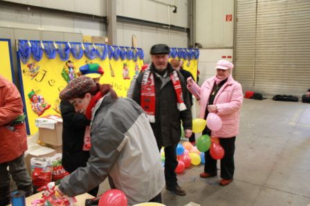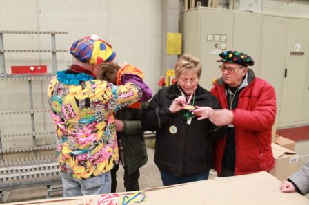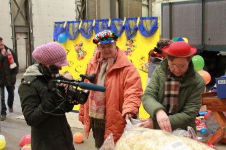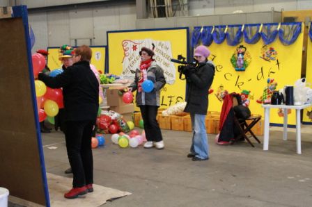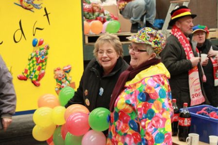 Endlich war es so weit. Karnevalssamstag fand das Richtfest der "Närrischen Bürgerhilfe" bei lausiger Kälte und angekündigtem Schnee statt. Vor dem Veedelszoch wurde der Wagen fertig gestellt. Die Platten mussten befestigt werden, die originellen Puppen aufgehängt werden, Luftballons wurden massenweise zum Dekorieren aufgepumpt und schließlich wurde der Wagen dekoriert. Zur Überraschung hatte sich tags zuvor center.tv angekündigt, filmte die stimmungsvolle Fertigstellung und begleitete am Karnevalssonntag unseren Wagen sogar. Alle waren mit Herz und Seele dabei. Zwischendurch stärkten sich die Teilnehmer bei der Kälte mit dem Düsseldorfer Nationalgetränk und hatten viel Spaß. Besonders freuten wir uns, dass uns Günther Hering noch Tipps für die Fertigstellung des Wagens geben konnte. Die Crew um Rainer Klöpper, die schon seit dem Sommer des letzten Jahres auf diesen Tag hinarbeitete, traf sich regelmäßig. Mehrere Frauen bastelten als Dekoration für den Wagen viele Puppen und waren dabei sehr kreativ und ideenreich. Es musste für das Motto "Jeck - we can" am Wagen selbst geschliffen, grundiert und gemalt werden. Dafür stellten Mitglieder und Freunde der B.H.G. ihre Freizeit zur Verfügung und verzichteten auf Ferien.