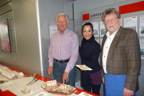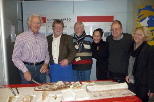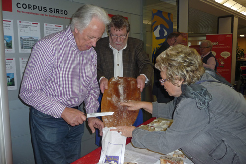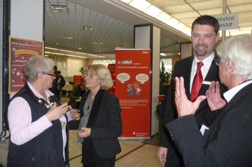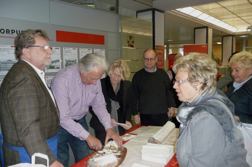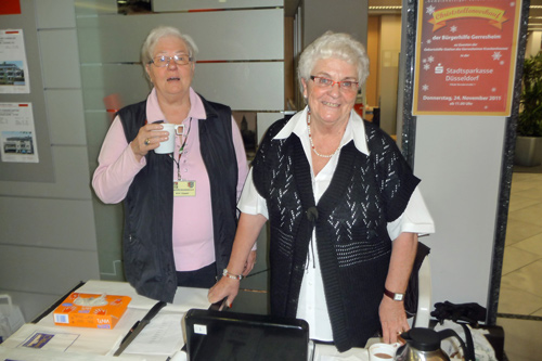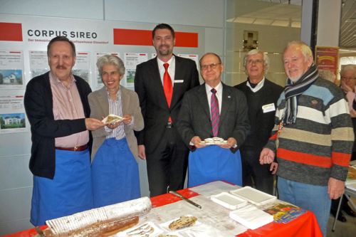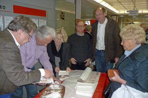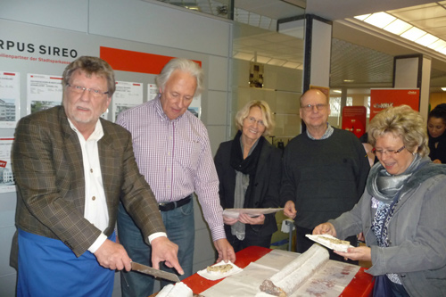 Zum ersten Mal verkaufte die Bürgerhilfe Gerresheim am Freitag, dem 24.11.2011 Christstollen in der Stadtsparkasse auf der Benderstraße. Der Erlös dieser Veranstaltung kommt der Geburtenhilfe-Station des Gerresheimer Krankenhauses zu gute. Um 14.30 Uhr war von den von der Bäckerei Oehme gestifteten fast 15 Metern Chrisstollen kaum etwas übrig. Denn die Liste der Prominenten, die sich in den Dienst der Sache stellten und Christstollen verkauften, war neben den vielen Helfern schon sehenswert. Wann hat der einfache Bürger schon einmal die Möglichkeit von so vielen Persönlichkeiten bedient zu werden und ins Gespräch zu kommen? Dank gilt in besonderer Weise unserer 1. Bürgermeisterin, Frau Dr. Strack-Zimmermann, Gerd Welchering, dem Ex-Baas der Düs-seldorfer Jonges, Herrn Hans-Peter van Hauten vom Fußballverband Niederrhein, Andreas Preuß, Manager von Borussia Düsseldorf, Dieter Bierbaum, langjähriger Stadionsprecher von Fortuna Düsseldorf, Frank Flatten, Manager bei der H.S.G. Düsseldorf mit Spielern, Frau Alev Akin vom Gerresheimer, den Ärzten des Gerresheimer Krankenhauses, Hanno Bremer, Bezirksvorsteher im Stadtgebiet 7 und vielen anderen. Bei diesem großartigen Erfolg konnten Hans Küster, der 1. Vorsitzende der Bürgerhilfe Gerresheim und Armin Majic, Geschäftsstellenleiter auf der Benderstraße, nur strahlen.