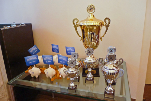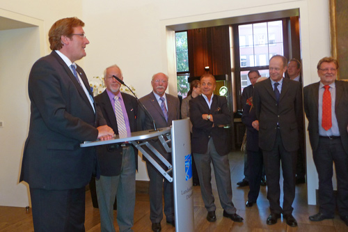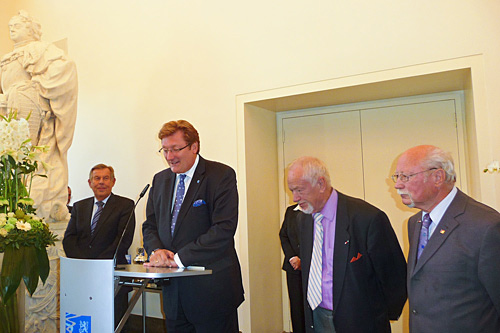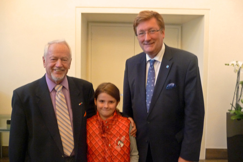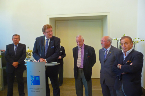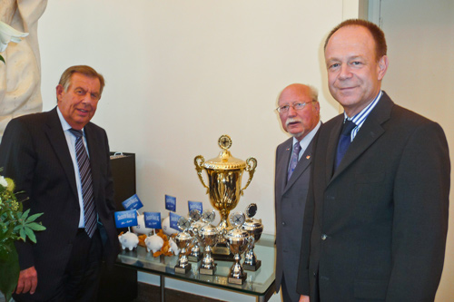 Oberbürgermeister Dirk Elbers ehrte am Donnerstag, dem 13. Oktober die Sieger des Radschlägerturniers der Bürgerhilfe Gerresheim traditionsgemäß im Düsseldorfer Rathaus. Dabei würdigte er das Engagement der Bürgerhilfe und nahm sich bei der sehr schönen Siegerehrung viel Zeit für die kleinen Helden und sprach mit fast allen Kindern und Eltern. Bei der Urkundenübergabe gab er jedem Kind die Hand. Er forderte Maximilian als einzigen Jungen auf, bei seinen Altersgenossen für das Radschlagen zu werben. Er amüsierte sich, wie voll bepackt die Kinder waren, so dass sie die Pokale kaum noch in den Händen halten konnten. Denn es gab in diesem Jahr zum ersten Mal neben Präsenten der Bürgerhilfe und der Stadt von der Deutschen Bank an Stelle eines Sparbuches ein großes Sparschwein mit 20 – 50 Euro, ein Einfall von Heinz Lückerath, dem Filialleiter von der Benderstraße, der von Stefan Märkl aus dem Düsseldorfer Vorstand begleitet wurde. Der Oberbürgermeister organisierte noch Tragetaschen, damit die kleinen Helden alle Geschenke nach Hause schleppen konnten und half beim Einpacken.