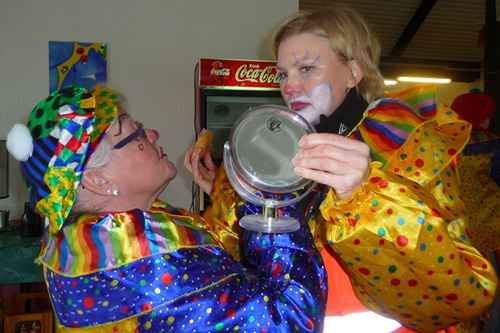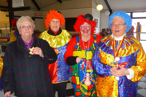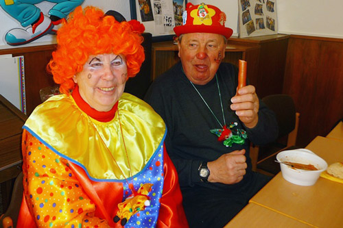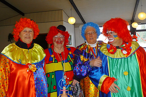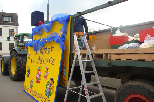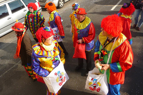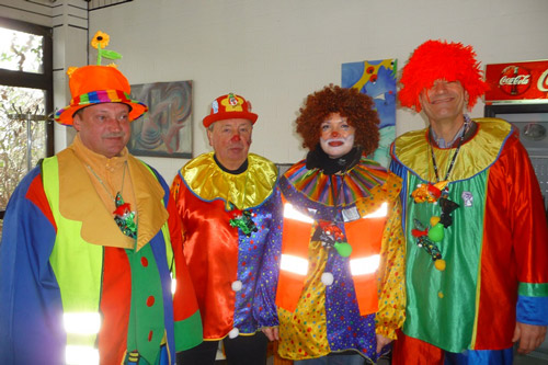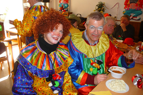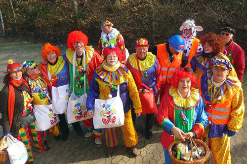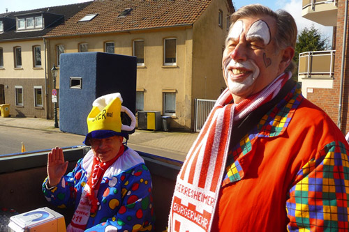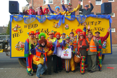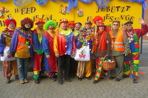 Am Karnevalssonntag trafen sich die Mitglieder der närrischen Bürgerhilfe um 9 Uhr in der Kantine der ehemaligen Glashütte zum obligatorischen Frühstück. Dabei bemalten sich die Mitglieder gegenseitig die Gesichter. Es fand sozusagen der letzte Schliff an den Clowngesichtern statt. Auf dem eigenen gelben Karnevalswagen, der tags zuvor fertig gestellt wurde, stand als Motto "Hee weed jelaacht, jebützt un jesunge“. Die Frauen hatten den gelben Wagen in mühevoller Kleinarbeit mit Puppen verziert. Jetzt ging es zum Aufstellungsplatz auf der Quadenhofstraße. Wir hatten Platz 35. Pünktlich zum Start um 11.11 Uhr strahlte wie auf Kommando die Sonne. Ein Erlebnis war auch, dass wie erstmals im letzten Jahr, fast alle Wagen an uns vorbeizogen, da wir fast am Schluss standen. Alfred Schulz und Joachim Heik sorgten für die tolle abwechslungsreiche Musik. In diesem Jahr wurde sehr viel Popkorn geworfen. Damit konnte man nicht so weit werfen, da es relativ leicht war und bei Wind die Wurfrichtung manchmal unberechenbar war. Im Vergleich zum letzten Jahr war die Fußgruppe unserer Clowns viel größer, schätzungsweise waren wir 25 Personen. Auf dem Wagen waren durch plötzliche Krankheitsfälle, wie zum Beispiel Hans Küster, weniger Personen, so dass wir uns beim Nachfüllen der Taschen sputen mussten. Außerdem waren, wie bei allen Karnevalszügen die Sicherheitsbestimmungen verschärft worden, was vorher einiges Kopfzerbrechen machte. Doch als es dann beim Zug so toll klappte, die Sonne schien und die Zuschauer so toll mitschunkelten, strahlten alle Clowns der Bürgerhilfe. Nachdem sich der Zug nach etwa 2 Stunden Wegzeit auflöste, fuhren wir mit dem Wagen zunächst zu den Räumen der Bürgerhilfe Gerresheim, wo ein Teil den Wagen verließ und die tatkräftigen Herren der Truppe weiterfuhren, um den Wagen zunächst abzubauen. Erika hatte bei der B.H.G. ein tolles Essen vorbereitet. Hervorzuheben ist der leckere Kartoffelsalat mit Würstchen, dazu die schon berühmte Gulaschsuppe. Doch angeblich soll ihre Hühnersuppe noch besser schmecken. Natürlich durfte das leckere Bier nicht fehlen. Der Großteil der Truppe, der hier noch hingekommen war, erlebte einen wunderbaren Nachmittag.