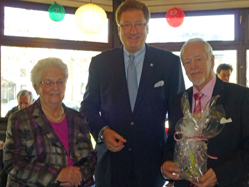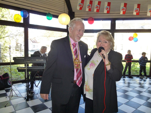 Als Überraschungsgast kam Oberbürgermeister Dirk Elbers mit seiner Frau, um beiden, Hans Küster, den eine Zeitung Mr. Bürgerhilfe nannte, und Resi Roski, seiner besseren Hälfte, zum 75. Geburtstag zu gratulieren. Hanno Bremer, Bezirksvorsteher im Stadtbezirk 7, verlieh Hans Küster nach seiner Laudatio die Ehrenmedaille der Bezirksvertretung zusammen mit einer Urkunde und Ratsfrau Angelika Penack-Bielor überreichte Resi Roski einen farbenprächtigen Blumenstrauß. Zu den Gratulanten gehörten unter anderem Staatssekretär Karl-Heinz Krems, Rolf Buschhausen, Dr. Edmund Spohr von der AGD, Vertreter des Sana-Klinikums Gerresheim wie Professor Dr. Andree oder Ratsfrau Helga Leibauer mit ihrem Mann. Natürlich waren viele Mitglieder der Bürgerhilfe zum Gratulieren gekommen. Der Vorstand überreichte den beiden Geburtstagskindern einen selbst erstellten Bildband über die Aktionen der Bürgerhilfe der letzten Jahre und weiterhin etwas für das gemeinsame Campen. Herr ten Eicken vom Rheinboten überraschte das Paar mit einer extra erstellten Sonderseite des Rheinboten. Natürlich war die Familie sehr zahlreich vertreten. Von Resis Seite war sogar ein Schwager extra von Schweden angereist. Hans Küsters Sohn moderierte die Veranstaltung. Sein Enkel Kevin spielte mit dem Fanfaren-Corps Düsseldorfer-Radschläger und brachte nachher mit 3 Urenkelkindern ein Ständchen. Viele Gerresheimer Vereine und Institutionen waren gekommen, um Dank zu sagen. Sehr originell waren die Kids der Kindertagesstätte Maria vom Frieden, die ein Lied in Tierkostümen vortrugen, was den Geburtstagskindern sehr zu Herzen ging. Der Gerresheimer Posaunenchor der evangelischen Kirche brachte die Gäste zu Anfang in Festtagsstimmung. Das Duo Joachim Heik und Alfred Schulz sorgten immer wieder für musikalische Akzente. Ralph Marquis und Marita Weiss brachten musikalische Ständchen und die Anwesenden sangen bei ihren Liedern mit. Die Jugend-Tanzgruppe des Post S.V. musste mehrfach Zugaben geben und die Muckeköpp begeisterten in ihrer unnachahmlichen Art. So viele Freunde und Bekannte waren zum Gratulieren gekommen. Dieser Tag wird für beide, die sich für die Bürgerhilfe Gerresheim voll engagieren und helfen, wo sie kännen, unvergesslich bleiben.
