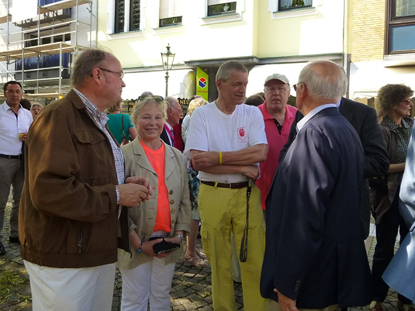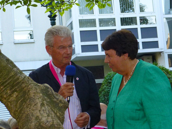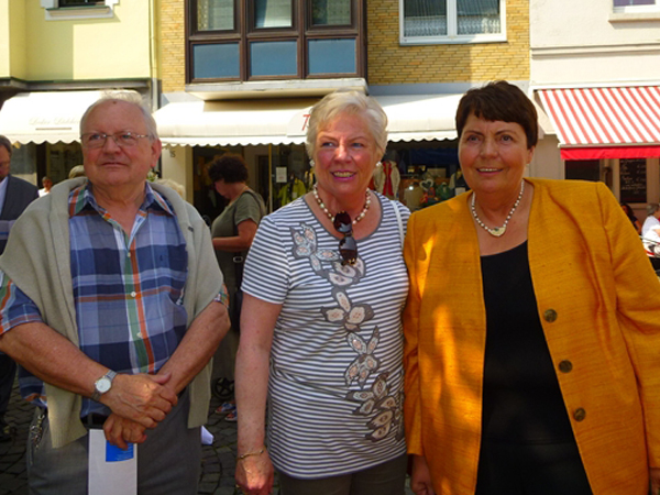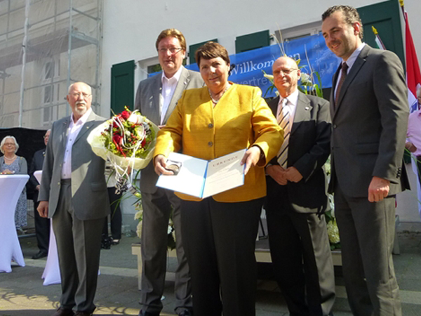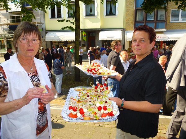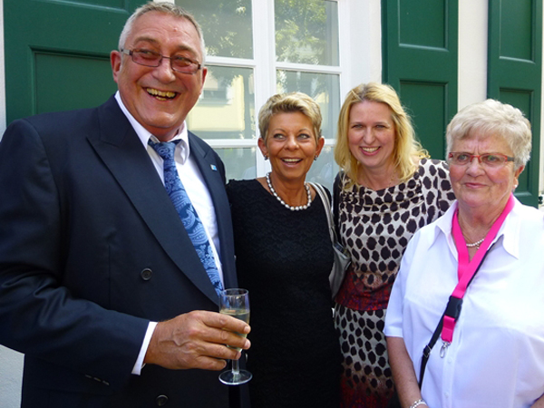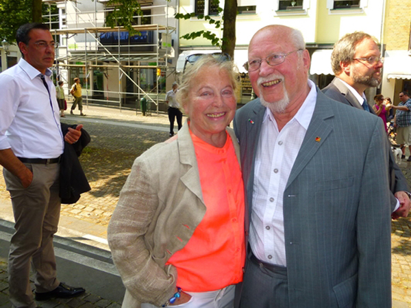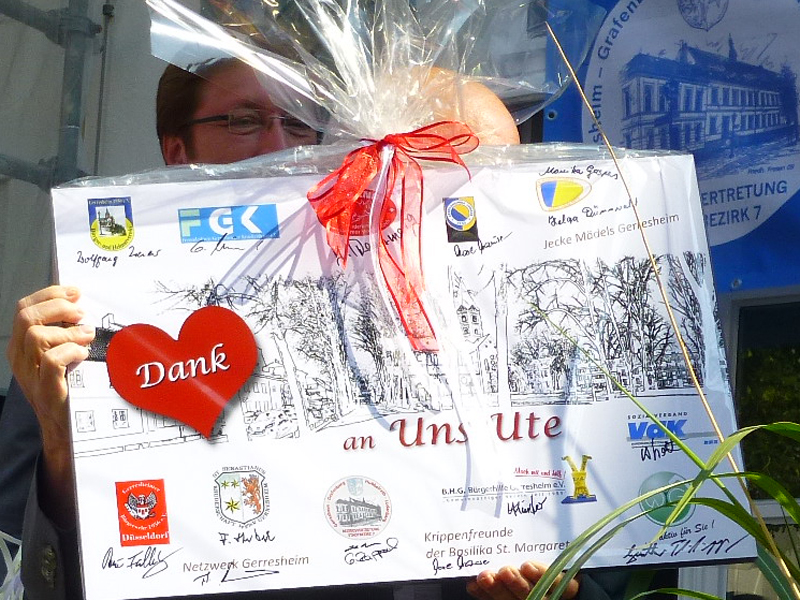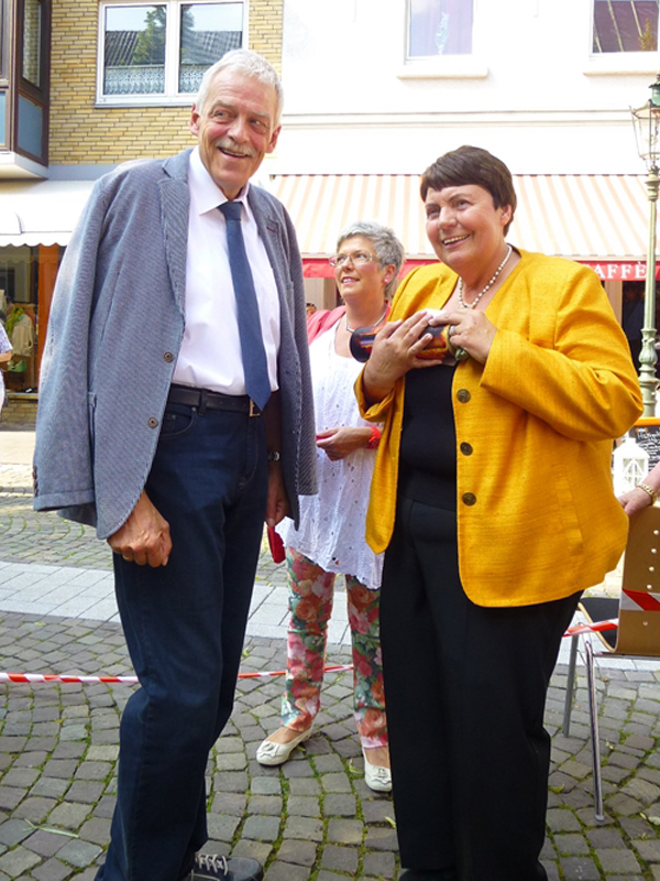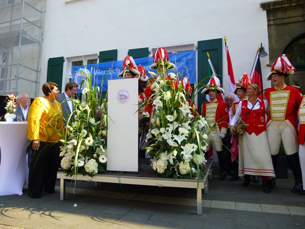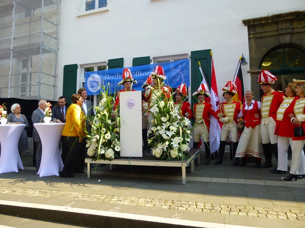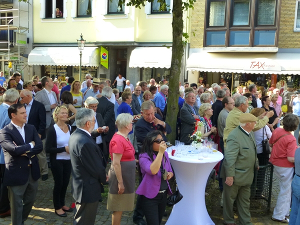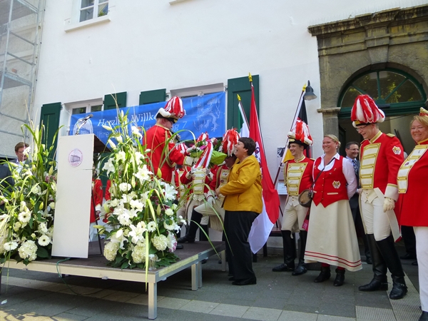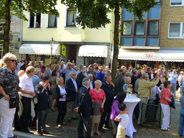 Ute Schulz, in Gerresheim meist „Uns Ute“ genannt, feierte bei strahlendem Sonnenschein ihr 50 jähriges Berufsjubiläum zunächst vor dem Gerresheimer Rathaus, wo Ute geehrt wurde. Bezirksvorsteher Hanno Bremer und unser Oberbürgermeister Dirk Elbers lobten ihr Engagement in den vielen Gerresheimer Vereinen, in denen sie ehrenamtlich aktiv ist und sich für ihre Mitmenschen und soziale Belange einsetzt. Im Anschluss an die Laudatio bekam die Schirmherrin der Bürgerhilfe Gerresheim die Ehrenmedaille der Bezirksvertretung verliehen. Prominente aus allen Parteien, aus ihrer Branche und der Wirtschaft wie viele Gerresheimer Bürger, Vereinsvertreter und nahe Verwandte waren gekommen, um Ute Schulz zu ehren. Sogar aus der Nähe von Meschede, wo sich Ute bei der Jagd entspannt, war man sehr zahlreich extra mit einem vollen Bus gekommen. Herr Fuhrmann überreichte ihr im Namen des Berufsverbandes stellvertretend den silbernen Meisterbrief zum 50 jährigen Berufsjubiläum und lobte ihren Einsatz und ihre Treue. Die vielen Vereine, in denen Ute tätig ist, sagten mit einer von den Vereinsvorsitzenden unterschriebenen Urkunde symbolisch danke. Eine einzigartige Aktion. Zu aller Überraschung überreichte der Bundestagsabgeordnete Thomas Jarzombek eine Biographie unserer Bundeskanzlerin Angela Merkel, in der eine handschriftliche persönliche Widmung stand. Zwischendurch wurden Häppchen und Getränke von überwiegend Mitgliedern der Bürgerhilfe gereicht. Stefan Friedel brachte mit Mitgliedern der Gerresheimer Bürgerwehr ein musikalisches Ständchen, ein Potpourri Düsseldorfer Brauchtumslieder. Die Schützengruppen, die zu Anfang sehr zahlreich aufmarschierten und musikalische Einlagen brachten, ehrten damit Ute Schulz und Pfarren Sülzenfuß, der sein 40 jähriges Priesterjubiläum in diesen Tagen feiert. Höhepunkt war der große Zapfenstreich, der mit der Nationalhymne endete. Diese Ehrung und Wertschätzung wird nur wenigen in Gerresheim zu Teil. Ute Schulz bedankte sich sichtlich gerührt, besonders auch bei ihrem Geschäftsteam mit Frau Wippermann und weiterhin bei Frau von Rappert, der Verwaltungschefin im Gerresheimer Rathaus, für die tolle Organisation und die vielen Überraschungen.