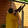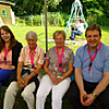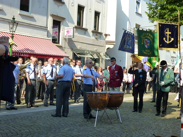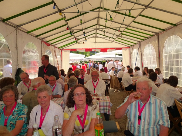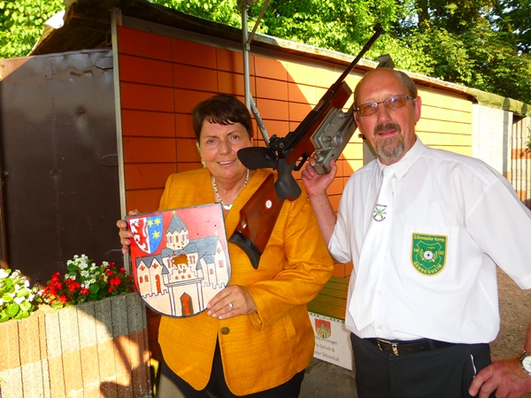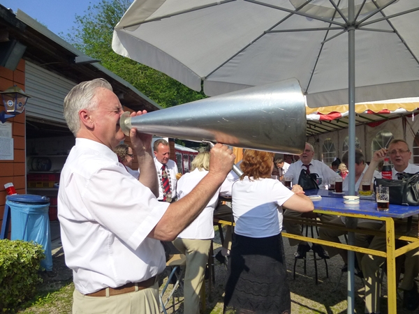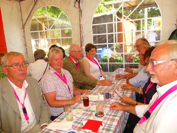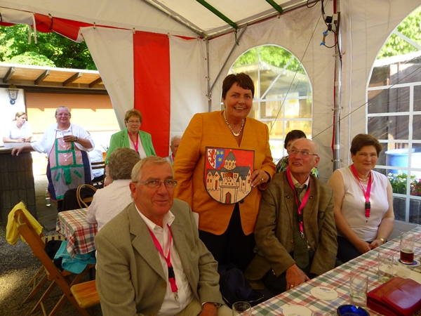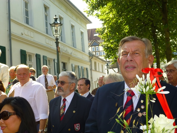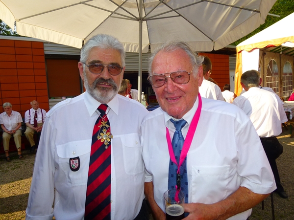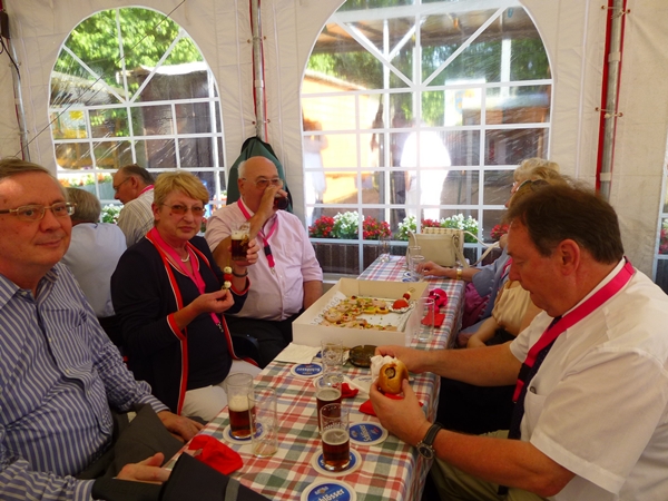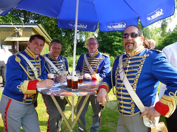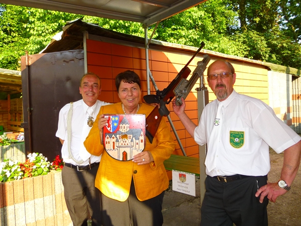 Anschließend zogen die meisten Gäste, angeführt von den Schützen und vielen anderen Vereinsgruppierungen, zum Schützenplatz, wo jeder auf den Ute Schulz – Jubiläumsvogel schießen konnte. Bei der Hitze war es klar, dass man sich zunächst der schweren und warmen Uniformen entledigte, um feuchtfröhlich zu feiern. Der Knüller war, dass Ute bei reger Beteiligung ihren eigenen Vogel unter großem Jubel kurz vor 19.00 Uhr abschoss.