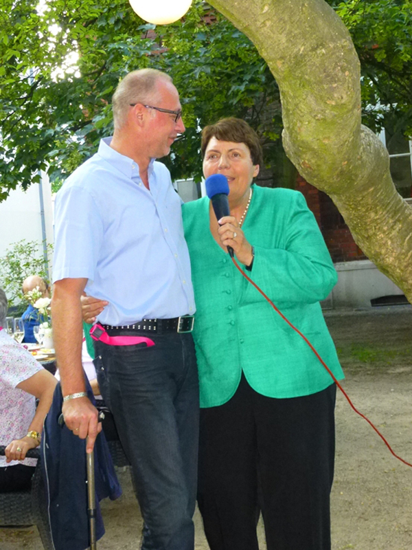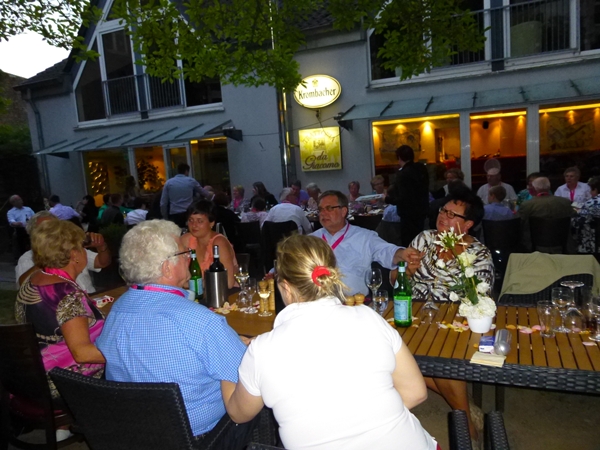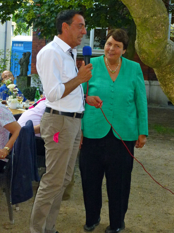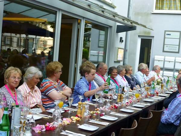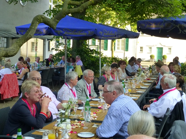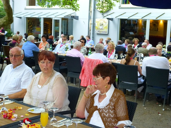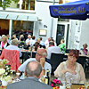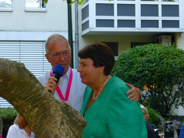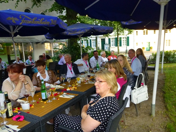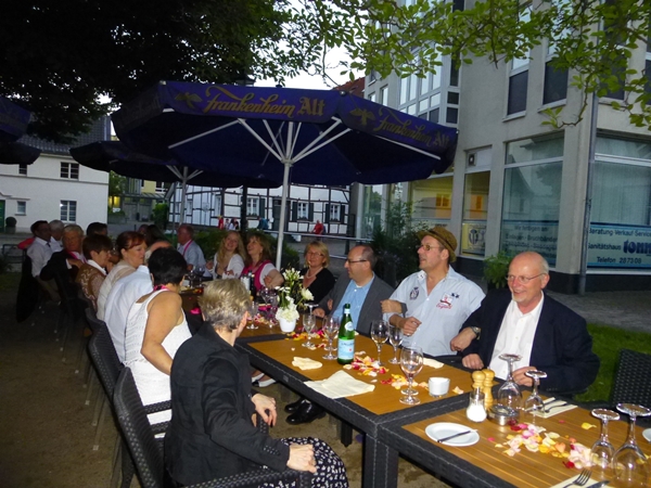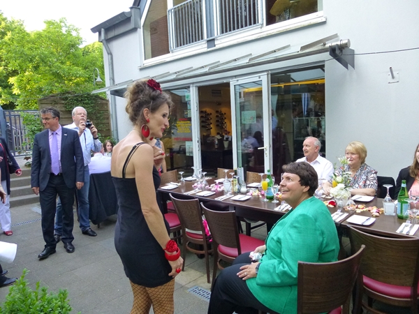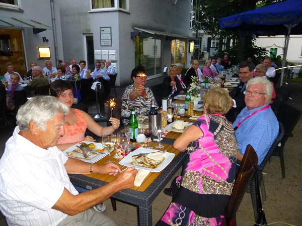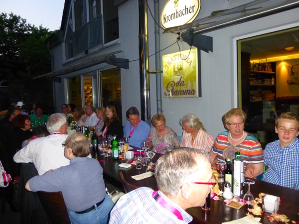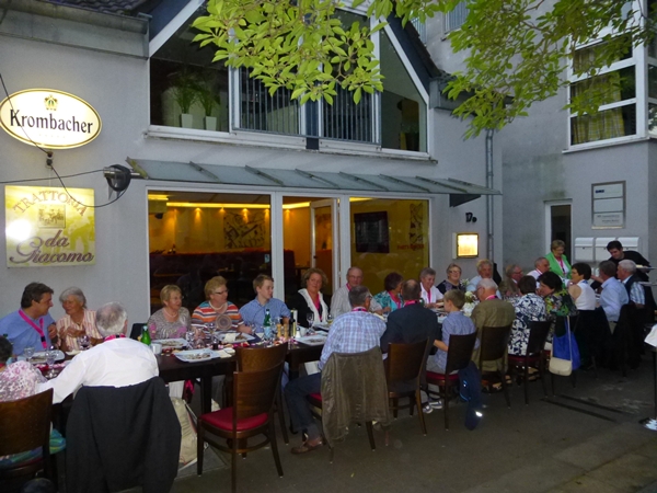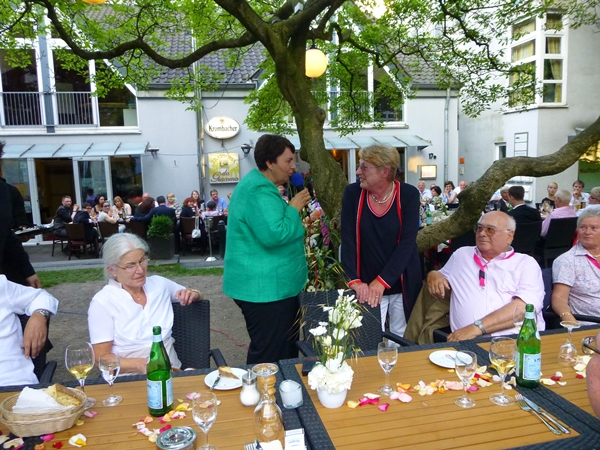 Während es auf dem Schützenplatz rege weiter ging, feierten geladene Gäste dann noch in der Trattoria Da Giacomo weiter. An Stelle von Geschenken bat Ute im Vornherein um eine Spende für die Bürgerhilfe Gerresheim. Hieran sieht man wieder, wie sozial Ute eingestellt ist, wie es unser Oberbürgermeister Dirk Elbers trefflich nachmittags schon sagte. Als Überraschung sang hier ein Chor der Gustav-Adolf-Gemeinde. Dadurch motiviert erzählte Ute Schulz einiges aus früheren Zeiten. Während der Menügänge stellte sie einige der Gäste vor, so zum Beispiel einige aus ihrer Branche, Einheimische wie Dr. Birken, Bäckerehepaar Schmalz oder Apothekerehepaar Herbort von der Rats-Apotheke. Ralph Marquis, begleitet von seiner Frau, brachte nach dem Essen ein Ständchen und sang Düsseldorfer Lieder. Anschließend wurde den beiden Geburtstagskindern, darunter Giacomo selbst, musikalisch unter Wunderkerzen gratuliert. Hans Küster, Dr. Petersen mit Frau und Ehepaar Brück, stellvertretend für die Bürgerhilfe, waren bei angenehmen Temperaturen wie alle Gäste begeistert von der Atmosphäre. Kevin Küster und seine Freundin brachten gegen Ende des Abends noch ein Trompetenständchen dar. Die Angestellten von Ute Schulz hatten sich noch eine Überraschung für Ute ausgedacht. Joachim Heik und Alfred Schulz brachten zwischendurch immer wieder musikalische Einlagen. Zum Schluss gilt es nochmals Ute Schulz danke zu sagen für den Tag, ihren Einsatz für die Bürgerhilfe Gerresheim und den Stadtteil.