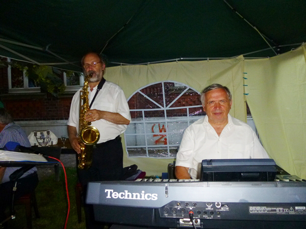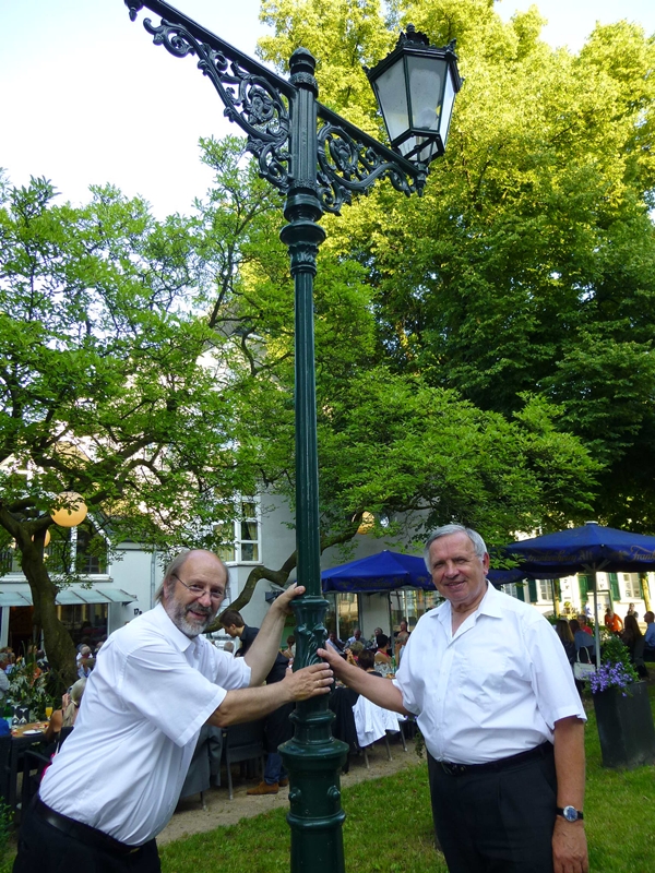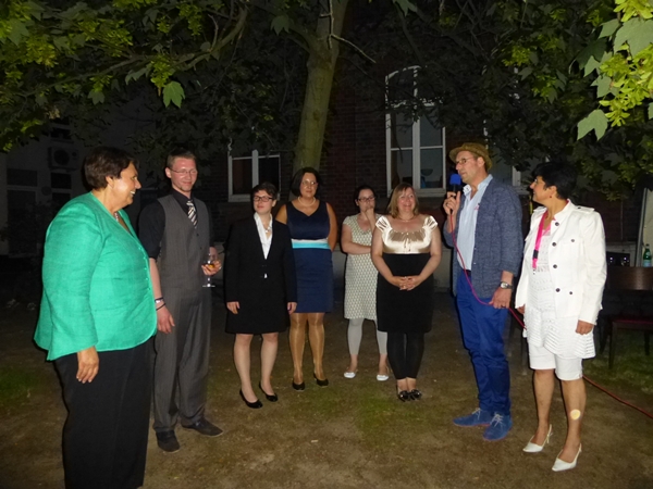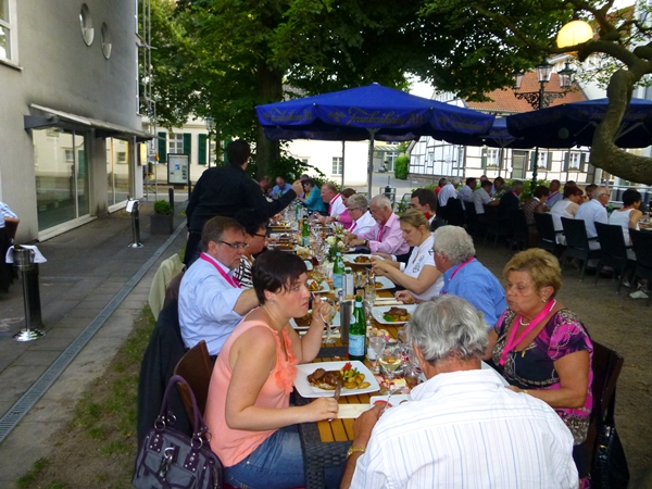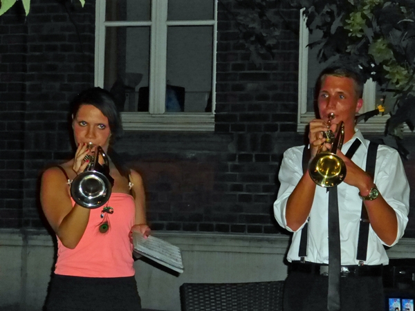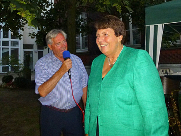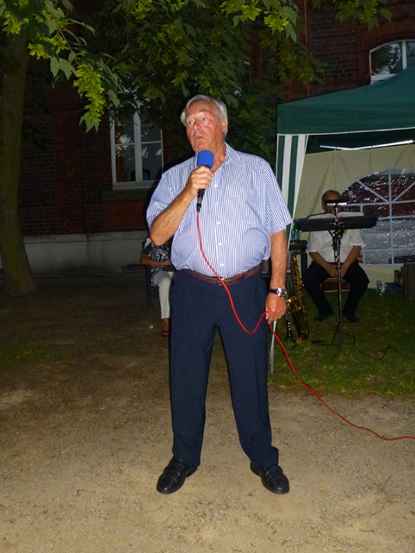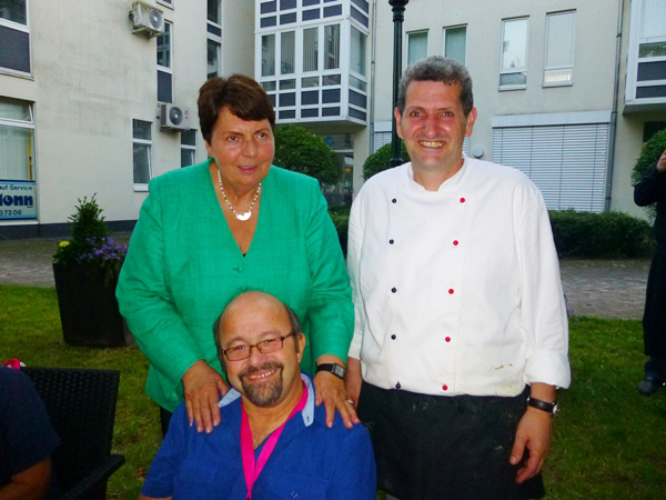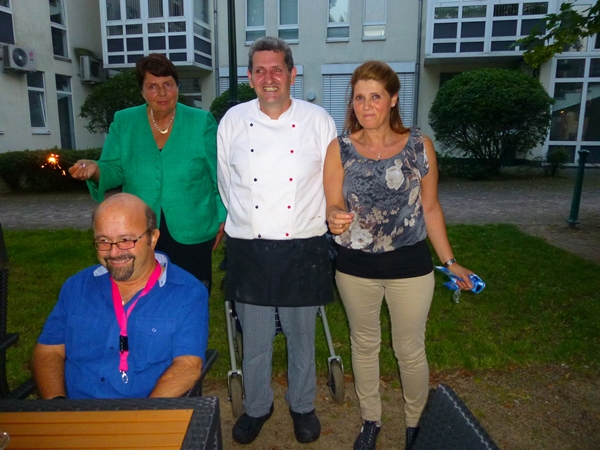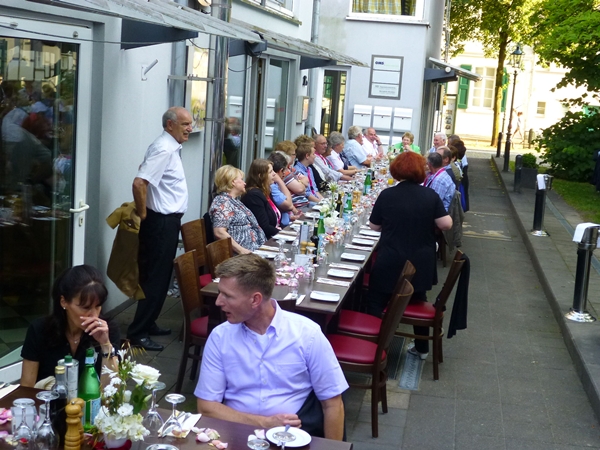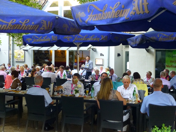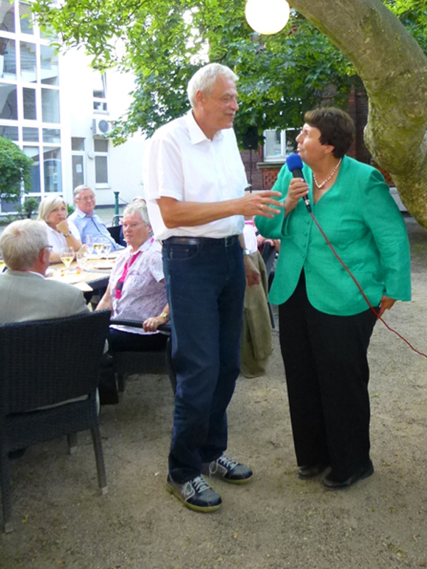 Während es auf dem Schützenplatz rege weiter ging, feierten geladene Gäste dann noch in der Trattoria Da Giacomo weiter. An Stelle von Geschenken bat Ute im Vornherein um eine Spende für die Bürgerhilfe Gerresheim. Hieran sieht man wieder, wie sozial Ute eingestellt ist, wie es unser Oberbürgermeister Dirk Elbers trefflich nachmittags schon sagte. Als Überraschung sang hier ein Chor der Gustav-Adolf-Gemeinde. Dadurch motiviert erzählte Ute Schulz einiges aus früheren Zeiten. Während der Menügänge stellte sie einige der Gäste vor, so zum Beispiel einige aus ihrer Branche, Einheimische wie Dr. Birken, Bäckerehepaar Schmalz oder Apothekerehepaar Herbort von der Rats-Apotheke. Ralph Marquis, begleitet von seiner Frau, brachte nach dem Essen ein Ständchen und sang Düsseldorfer Lieder. Anschließend wurde den beiden Geburtstagskindern, darunter Giacomo selbst, musikalisch unter Wunderkerzen gratuliert. Hans Küster, Dr. Petersen mit Frau und Ehepaar Brück, stellvertretend für die Bürgerhilfe, waren bei angenehmen Temperaturen wie alle Gäste begeistert von der Atmosphäre. Kevin Küster und seine Freundin brachten gegen Ende des Abends noch ein Trompetenständchen dar. Die Angestellten von Ute Schulz hatten sich noch eine Überraschung für Ute ausgedacht. Joachim Heik und Alfred Schulz brachten zwischendurch immer wieder musikalische Einlagen. Zum Schluss gilt es nochmals Ute Schulz danke zu sagen für den Tag, ihren Einsatz für die Bürgerhilfe Gerresheim und den Stadtteil.