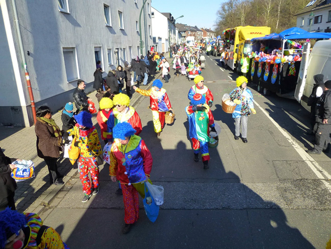 Wie es schon Tradition ist, fuhren die Wagen an allen übrigen vorbei, so dass jeder Teilnehmer am Zug auch die anderen Wagen sehen konnte, eine gute Idee. Ãber die Morper Straße und Heyestraße ging es am Quadenhof vorbei über Kölner Tor, wo alle Gruppen begrüßt wurden, Richtung Gerresheimer Rathaus. Die Fußgängerzone war ein reines Menschenmeer, wo alle begeistert jubelten. Nicht nur die Kids sammelten fleißig Wurfmaterial und ließen ihren Charme spielen. Gruppen hatten sich originell verkleidet wie zum Beispiel in Froschkostümen. Einige Gruppen sah man um Bierfässer versammelt. Weiter ging es über die Benderstraße, dann über die Von-Gahlen-Straße bzw. Unter den Eichen, dann weiter bis zum Quadenhof, wo sich der Zug auflöste. Die Stimmung war toll. Danach wurde meist in den Gaststätten oder privat weitergefeiert. Die Stimmung war einmalig, wie die Bilder, die ich vom Wagen der Bürgerhilfe Gerresheim gemacht habe, deutlich dokumentieren. Der Großteil der jecken Bürgerhilfe ging zu KlostermannÂs, die sich sehr viel Mühe gemacht haben und kurzfristig eingesprungen sind. Es muss dort, wie ich hörte, wie immer ein ganz toller Nachmittag gewesen sein. Ein Riesenkompliment und Dank an die Klostermanns!