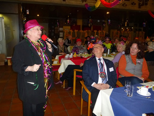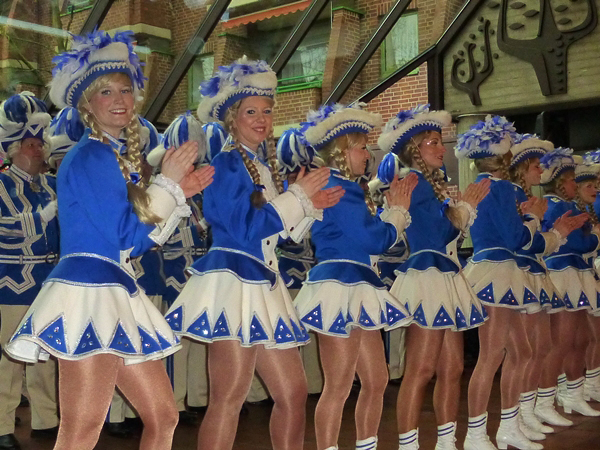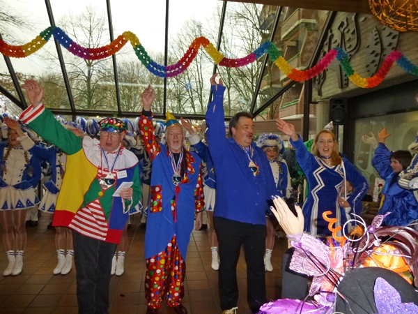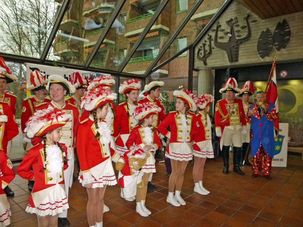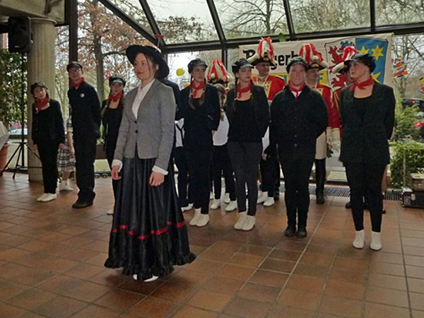 Ein weiterer Höhepunkt war natürlich das Düsseldorfer Prinzenpaar, Prinz Michael I. und seine Venetia Pia, das mit ihren Adjutanten gekommen war. Das Prinzenpaar nahm sich Zeit, erzählte, sang, ging durch die Reihen, verteilte Orden und nahm die 107jährige Seniorin in ihre Mitte, wobei deren Augen strahlten. Hans Küster, der erste Vorsitzende der Bürgerhilfe Gerresheim, der diese Sitzung zusammengestellt hatte, war ebenso begeistert wie sein Sohn, der moderierte, und die 3 Enkel, welche die Ordensverteilung übernahmen. Anschließend marschierte Blau Weiß, die Leibgarde unserer Venetia, mit voller Mannschaft auf und begeisterten mit Gesang, Tanz und anderen Aktionen, unterstützt von deren Trompetern und sonstigen Musikern, die aus Platzmangel an der Seite standen. Allein deren Ein- und Auszug war eine Augenweide.