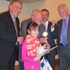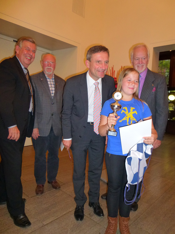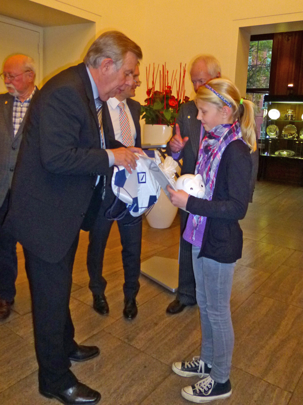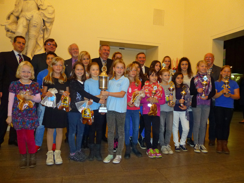 Weiterhin gab es Urkunden der Bürgerhilfe für die besten Kinder. An dem Turnier hatten 59 Kinder teilgenommen. In der Gruppe der jüngeren Kinder, 6-9 Jahre, nahmen 37 teil, darunter 2 Jungen, bei den älteren, 10-12 Jahre, 22 Mädchen. Die drei ersten Siegerinnen erhielten jeweils einen Pokal, überreicht von Willi Döring, der das Radschlägerturnier leitete, dazu einen Geldpreis mit Tasche und Sparschwein von Heinz Lückerath, dem Filialdirektor der Deutschen Bank auf der Benderstraße, und ein Präsent des Oberbürgermeisters. Dazu konnten Einzelfotos der Kinder bei der Übergabe mit dem Oberbürgermeister für das Erinnerungsalbum gemacht werden. Als Gesamtsiegerin bekam Luisa Schöneberg, wie im letzten Jahr auch schon, den großen Wanderpokal überreicht, der von Josef Hinkel gestiftet wurde. Strahlende Kinder der Hanna-Zürndorfer-Schule von der Benderstraße nahmen weiterhin den großen Wanderpokal für diejenige Schule in Empfang, welche die meisten Teilnehmer stellte. Anschließen wurde ein Foto mit allen Kindern gemacht. Danach gab es für alle Kids einen Radschläger, den Altstadtbäcker und Karnevalspräsident Josef Hinkel eigens für diese Veranstaltung gebacken hatte.