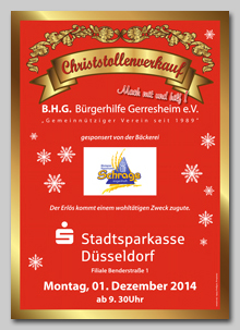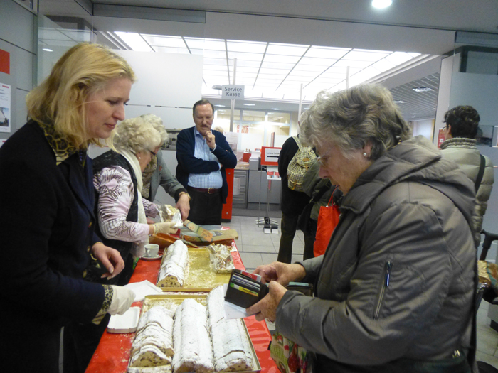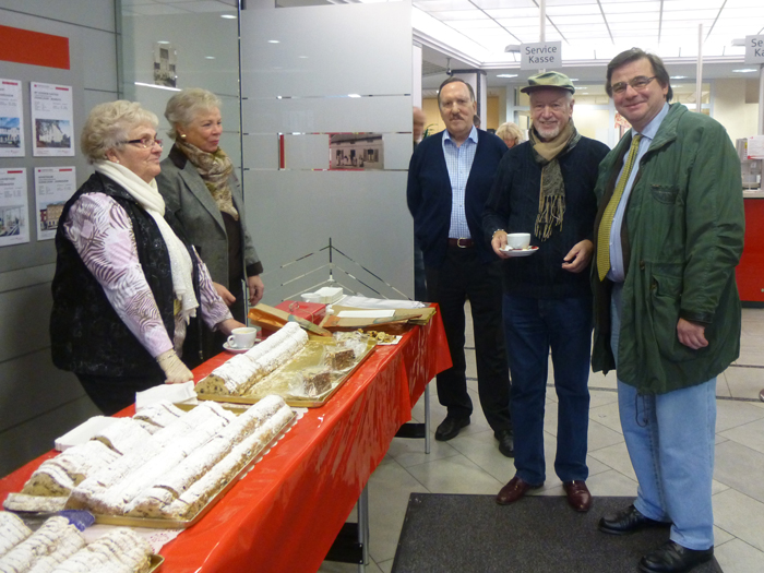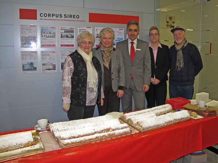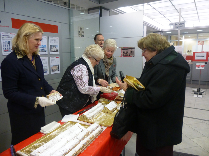 In der Filiale der Stadtsparkasse Düsseldorf auf der Benderstraße strahlten die Geschäftsstellenleiterin Melanie Günther und Filialdirektor Lütfü Sine am Montag, dem 1. Dezember 2014, als bei der Aktion mit der Bürgerhilfe Gerresheim etwa 6 Meter Christstollen verkauft wurden, der von der Bäckerei Schrade für den guten Zweck gespendet wurde. Der aufgereihte Anblick der Stollen um 9.30 Uhr war eine Augenweide - Stollen, so weit das Auge reichte. Diese Aktion in der Filiale hat mittlerweile schon Tradition. Prominente wie der ehemalige Stadionsprecher Dieter Bierbaum halfen beim Verkauf sehr aktiv und förderten so den Umsatz, wie es neben den Helfern der Bürgerhilfe Gerresheim auch weitere Prominente wie der Bezirksbürgermeister Karsten Kunert, Ratsfrau Angelika Penack-Bielor oder Andreas Preuß vom Tischtennisverein Borussia Düsseldorf taten. Toll war, dass auch unsere Düsseldorfer Bürgermeisterin Klaudia Zepuntke den Verkauf tatkräftig unterstützte. Die Aktion war ein großer Erfolg. Dank gilt an dieser Stelle den Helfern und dem edlen Spender. Hans Küster, der erste Vorsitzende der Bürgerhilfe Gerresheim kann sich freuen, denn der gesamte Erlös kommt wie immer den sozialen Anliegen der Bürgerhilfe Gerresheim zugute.