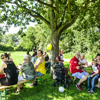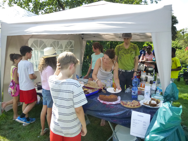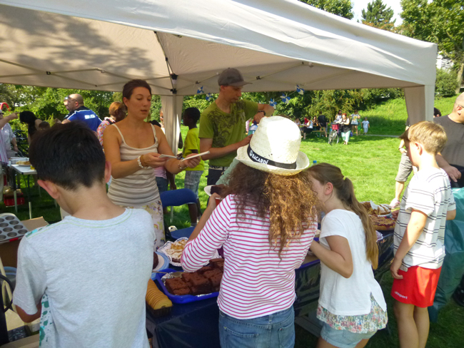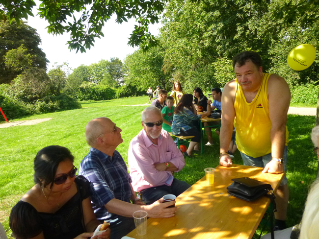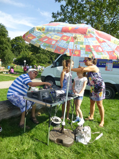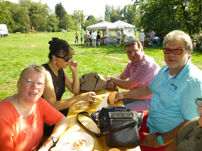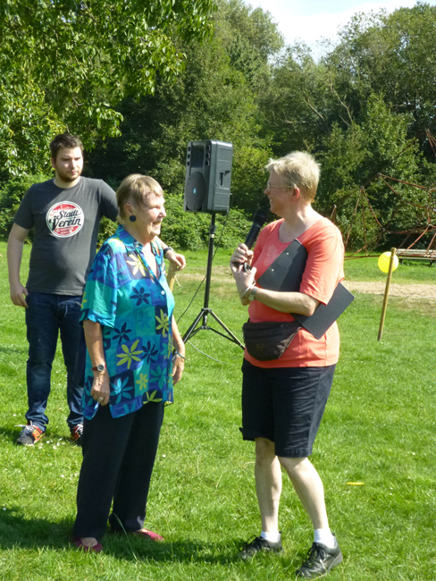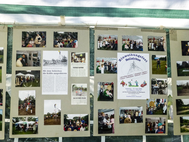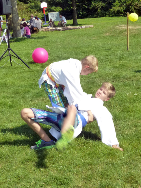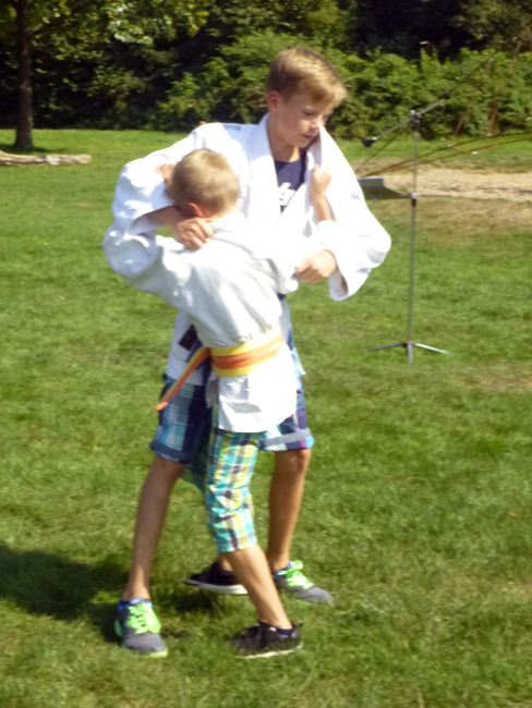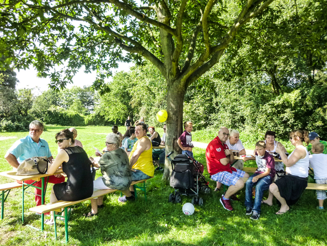 Neben dem Mitmachprogramm zeigten zwei Brüder Judogriffe. Kinder konnten sich im Polizeiauto fotografieren lassen und steuerten bei der Hitze den Getränkestand an. Andere stärkten sich mit selbstgebackenen Kuchen oder aßen Bratwürste, die von der Bürgerhilfe Gerresheim gestiftet wurden und die den Stand betrieb. Erwachene, wie Bezirksvorsteher Karsten Kunert, Ratsfrau Angelika Penack-Bielor oder Hanno Bremer suchten sich ein kühles Plätzchen. Es waren bei der Hitze zwar weniger Menschen da als vor 5 Jahren, wo ein Zirkuszelt für die Attraktion bei regnerischem Wetter sorgte, aber es herrschte eine tolle Stimmung. Dank gilt den Initiatoren der Initiative und den Müttern, die sich seit 15 Jahren um den Spielplatz an der Diepenstraße kümmern. An Stellwänden mit Bildern der letzten 15 Jahre konnte man die Erfogsstory nachvollziehen. Ein Nachbarschafts-Cafe, eine Reihe über Natur oder eine Schaukel für ältere Kinder sind angedacht.