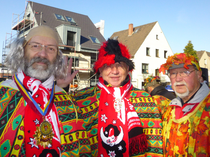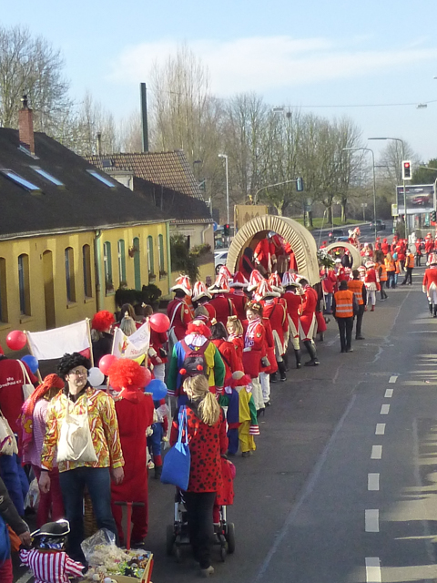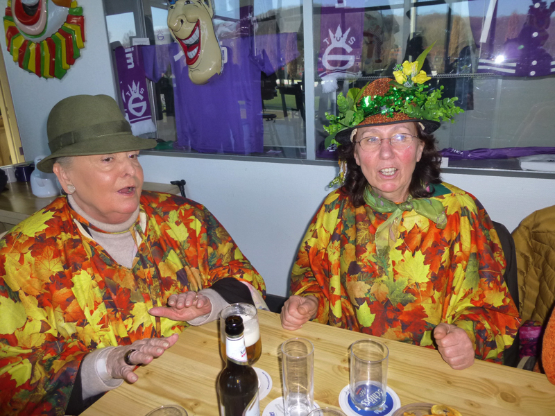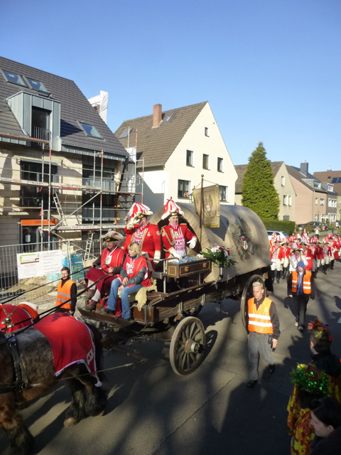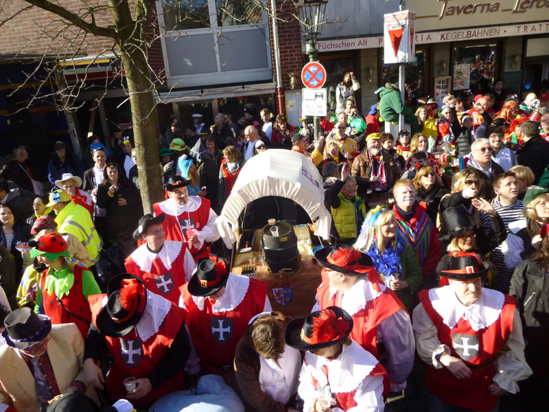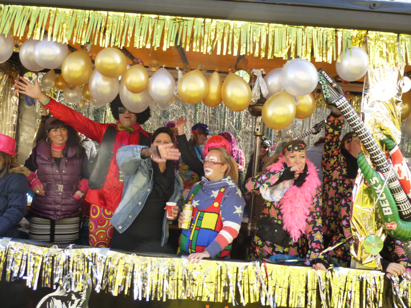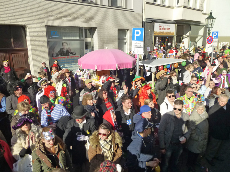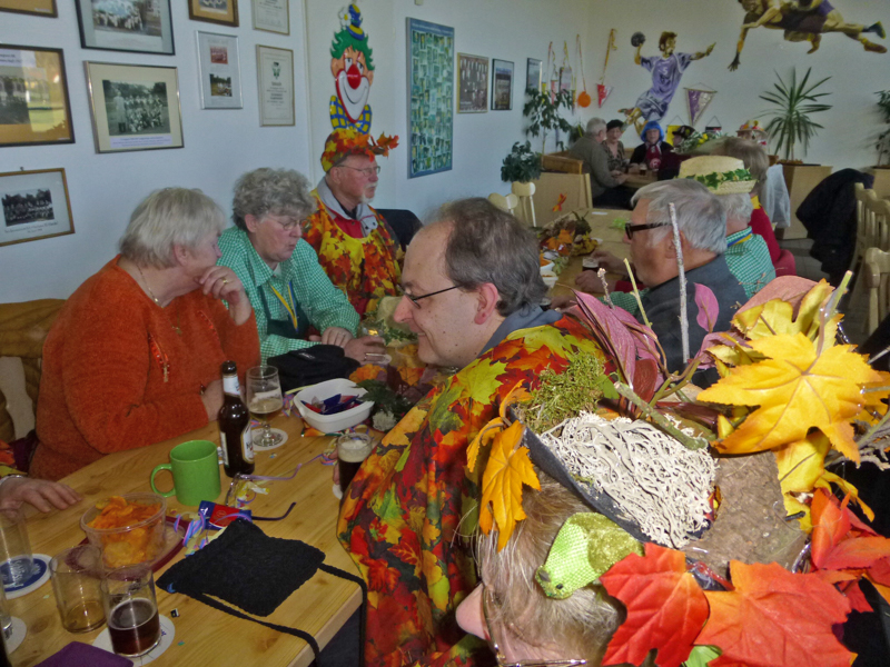 Die Restaurants und Kneipen wurden von den meisten Zuschauern nach dem Zoch angesteuert. Dort wurde zum Teil bis in den späten Abend dicht gedrängt gefeiert, nachmittags bei dem Superwetter auch draußen. Unsere Gruppe saß nach dem Zoch im Vereinshaus vom TUS zusammen. Allerdings stießen die fleißigen Mitglieder, die den Wagen abbauten, 2 Stunden später dazu.