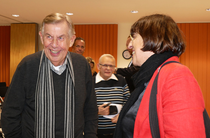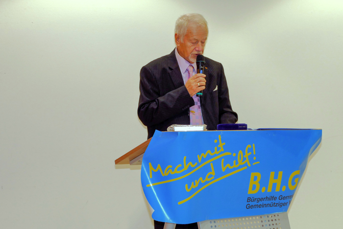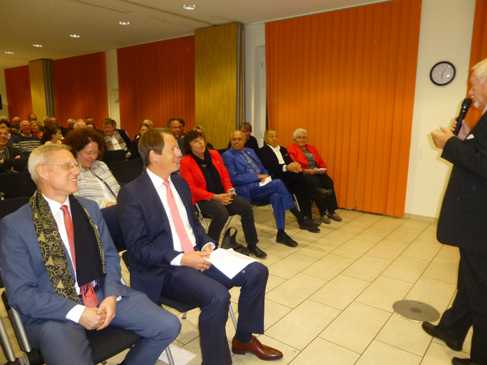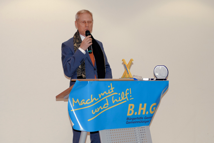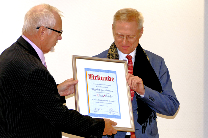 Die 15.te Verleihung der Ehrenmedaille der Bürgerhilfe Gerresheim fand im Ambiente des Sana Krankenhauses Gerresheim am Montag, dem 13. November 2017 statt. Christian Engler, Geschäftsführer des Krankenhauses informierte zunächst bei der Begrüßung über die Bauarbeiten zum Parkhaus und über das geplante Beatmungszentrum. Anschließend hielt er als letzt jähriger Preisträger der Ehrenmedaille die Laudatio für den Journalisten Klaus Schröder. Er gab Einblicke in dessen Aktivitäten der letzten 30 Jahre und würdigte sein Engagement für Gerresheim. So berichtete Klaus Schröder im Laufe der Jahre kontinuierlich über die Aktivitäten der Bürgerhilfe seit deren Bestehen, beginnend mit dem ersten Straßenfest, und hat dabei die Anzeigenblätter seit Jahrzehnten mitgeprägt. Ihm war Information und Inspiration für den Leser oberste Pflicht. Auch Dr. Maria Icking, stellvertretende Bezirksbürgermeisterin im Stadtbezirk 7, würdigte dieses Engagement. Hans Küster, der 1. Vorsitzende der Bürgerhilfe Gerresheim, lobte ebenfalls den Einsatz von Klaus Schröder und überreichte dem neuen Preisträger anschließend unter dem Beifall aller die Ehrenmedaille, die zugehörige Urkunde und Gerri, einen kleinen gelben Radschläger, Maskottchen der Bürgerhilfe. Aus der bewusst kurz gehaltenen Dankesrede von Klaus Schröder konnte man heraushören, dass für ihn die Arbeit an der Basis sehr wichtig ist. Zu dieser Auszeichnung des bescheiden auftretenden neuen Medaillenträgers waren viele Gerresheimer Persönlichkeiten gekommen, darunter auch der Landtagsabgeordnete Marco Schmitz, Ratsherr Rolf Buschhausen, die ehemalige Ratsfrau Rosemarie Theiß, Heinz Lückerath, Anisur Rahman von der Ursula-Rahman-Stiftung so wie viele Vertreter Gerresheimer Vereine und Geschäftsleute.