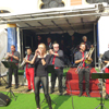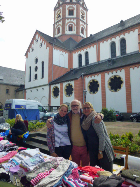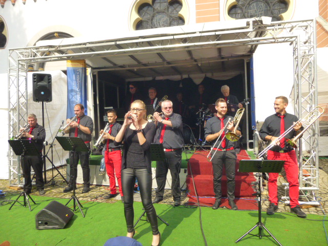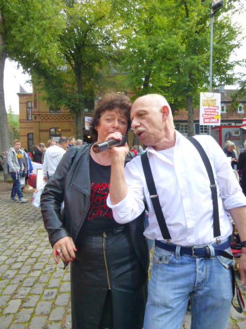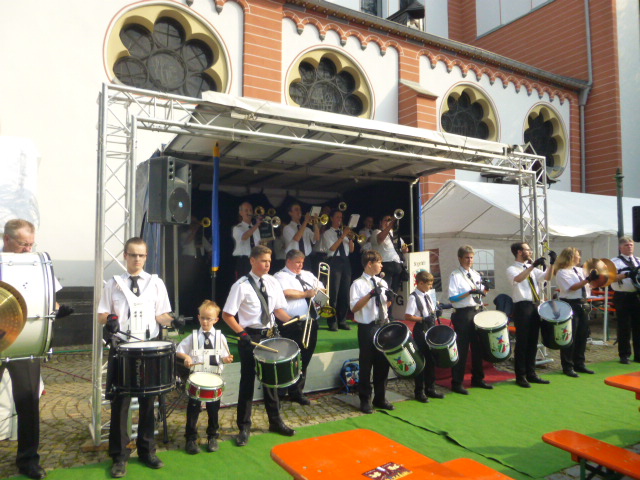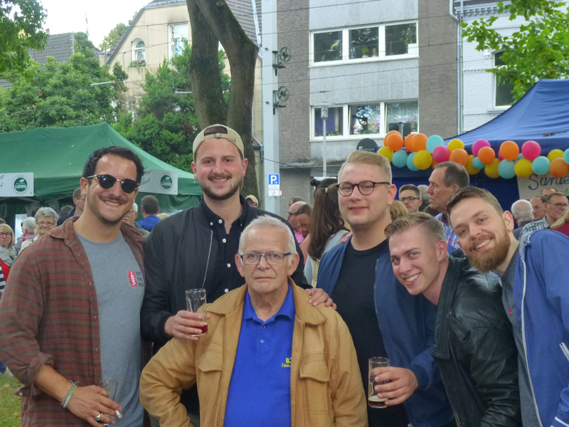 Nach dem Ende auf dem Gerricusplatz ging noch auf dem Apostelplatz die Post ab, wo abends unter anderem die Swinging Funfares die Stimmung anheizten, wo ich unter anderem mit ehemaligen Schülern ein Gruppenfoto machte. Die Schulband vom Rückert-Gymnasium und Kinder der Gerresheimer Bürgerwehr traten auf. Eine Cheerleader Show gab es wie eine Playbackshow der "Gerresheimer Mädchen". Im Laufe des Tages hatte es auch hier bis hin zur Friedingstraße viele Highlights gegeben, darunter Bands, Gruppen, eine Modenschau und einen Clown. Viele Geschäfte hatten sich Originelles einfallen lassen. Neben der Bühne auf dem Apostelplatz gab es eine weitere beim Heinrich-Könn-Straßenfest, wo ab 15 Uhr auch international kulinarische Vielfalt, Tanz und Gesang geboten wurden. Unter anderem gab es auch einen Beitrag von Flüchtlingen, eine Tai Wu Dao Demonstration wie auf dem Gerricusplatz, die Columbo Road, das Danietto Winterstein Quartett oder Jazz von Soundpool 38 oder Foof mit Jazz und Groove. Man hatte an diesem Tag trotz der zwei Schauer das Gefühl, dass ganz Gerresheim auf den Beinen war.