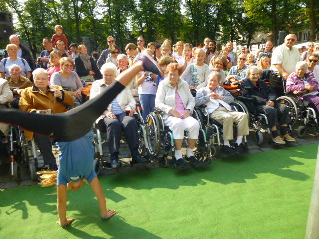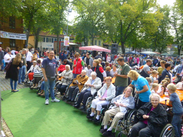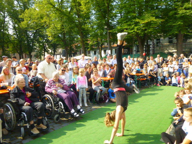 Kinder demonstrierten Tai Wu Dao Kampftechnik, darunter ein Deutscher Meister. Rechtzeitig zum Radschlägerturnier kamen, mit Hilfe von ehrenamtlich tätigen Angestellten der Deutschen Bank, Benderstraße, die Rollstuhlfahrer des Ferdinand-Heye-Hauses zum Festplatz.