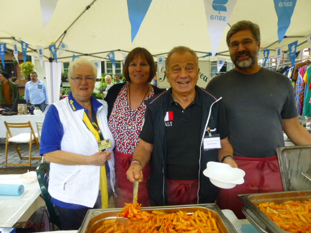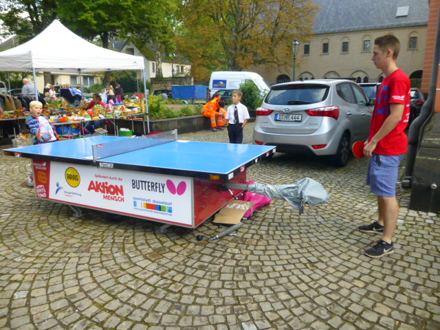 Im Laufe des Tages gab es noch andere Highlights. So konnten sich Kinder mit Spielern von Borussia Düsseldorf im Tischtennis messen. Kids machten vielleicht ein Schnäppchen beim Glücksrad von Cosmo Sports oder Erwachsene durften einen oder mehrere tolle Gewinne der Tombola nach Hause schleppen. Für Pasta sorgte Enrico de Angelis vom Ristorante Saltimbocca. Sana-Pflegedirektorin Maike Rost und Dr. Christoph Heidenhain, Chefarzt der Chirurgie, halfen kräftig beim Verkauf mit. Ein Renner waren weiterhin Kuchenstand und Erbsensuppe, doch auch kalte Getränke und Würstchen waren sehr gefragt.