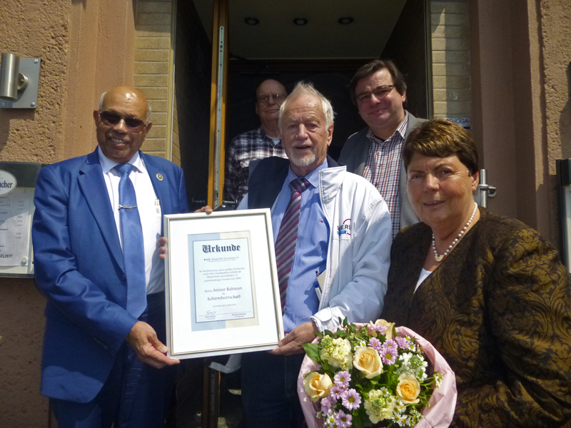 Nachdem sich Hans Küster, 1. Vorsitzender der Bürgerhilfe Gerresheim, bei Ute Schulz im Ambiente der Trattoria La Ruota am Montag, dem 14. Mai 2018 mit einem großen Blumenstrauß für ihr großes Engagement unter Anwesenheit von Bezirksbürgermeister Karsten Kunert und seines Vorgängers Hanno Bremer bedankt hatte, überreichte er stellvertretend für den Vorstand an Anisur Rahman die Urkunde zur Ernennung zum Schirmherrn der Bürgerhilfe Gerresheim und würdigte dabei seine Verdienste. Denn Anisur Rahman unterstützte die Bürgerhilfe in den letzten Jahren finanziell tatkräftig, zeigte unter anderem viel Engagement bei der Kindereinkleidung und ermöglichte zuletzt als Bildungsmaßnahme die Anschaffung von Laptops für eine Schule, was sonst nicht möglich gewesen wäre. Anisur Rahman selbst war bei der Urkundenübergabe sehr gerührt und freute sich, die Schirmherrschaft anzunehmen. Rückblickend auf die letzten fünf Jahre betonte er das gute Verhältnis zu Hans Küster und der Bürgerhilfe Gerresheim und will die Bürgerhilfe auch weiterhin unterstützen. Sein großes Ziel ist es: "Erhaltung und Verbesserung der Hilfe in Gerresheim. Er will seinen Beitrag leisten, den Verein zu schützen."