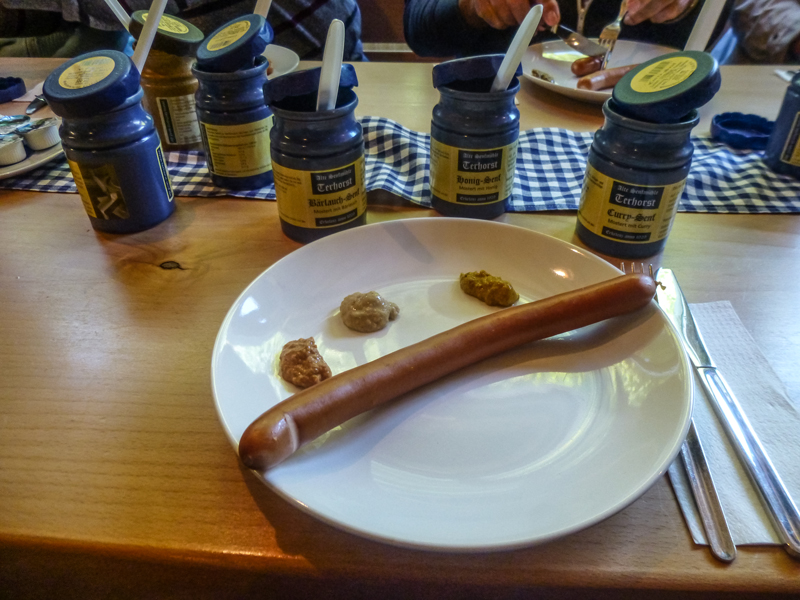 Um 11.30 Uhr erreichte der Bus Erkelenz, wo zunächst eine Stunde lang die Senfmühle Terhorst unter fachmännischer Führung besichtigt wurde. 1929 wurde die Mostertmühle von Alfred Terhorst in Mönchengladbach gegründet und von Walter Terhorst bis 1974 fortgeführt, dann aber auf Grund von konkurrierender Massenproduktion geschlossen. Schließlich wurde die Mühle durch Dorothea Terhorst und ihrem Team restauriert und nach Erkelenz verlagert, wo die Reisegruppe auch das vielfältige Gewürzsortiment und die selbst kreierten Senfrezepturen nicht nur bestaunten. Denn nach der Besichtigung gab es ein Brühwürstchen-Essen, wo alle Teilnehmer verschiedene Senfsorten reichlich ausprobieren konnten und hellauf begeistert waren.