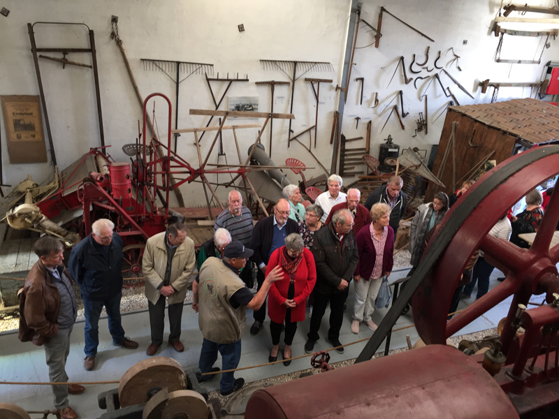 Um 12.30 Uhr ging die Fahrt weiter nach Gangelt-Schierwaldenrath, wo um 13.15 Uhr eine Fahrt mit der Selfkantbahn von Schierwaldenrath nach Gillrath und zurück auf dem Programm stand. Diese Fahrt mit dem historischen Schienenbus, einer Schmalspurbahn, auf einer Länge von 5,5 km begeisterte alle Teilnehmer um Hans Küster und war eine weitere Attraktion, die nicht nur Eisenbahnfreunde ins Schwärmen geraten ließ. Nach einer 20minütigen Busfahrt ging es dann nach Tüddern, wo als weiteres Highlight das Bauernmuseum Selfkant besichtigt wurde. Hier gab es eine Sammlung historischer Landmaschinen zu sehen, alte Traktoren, Dreschmaschinen, Stein- und Walzenmühlen, aber auch eine Bauernküche wie zu Großmutters Zeiten, eine Dorfschmiede, eine Schusterei und noch viele Dinge mehr wie eine Dampfmaschine, sozusagen ein Museum zum Anfassen. Nach dem Rundgang stärkten sich alle Teilnehmer im nahe gelegenen Cafe Penners ausgiebig bei Kaffee und tollen Waffeln mit Kirschen oder Beerenfrüchten. Wohlgesättigt, rundum zufrieden und voller Eindrücke ging es dann in einer etwas mehr als einstündigen Busfahrt zurück nach Gerresheim, wo die Fahrt ins Blaue kurz nach 18 Uhr am Gerresheimer Waldfriedhof endete.
