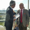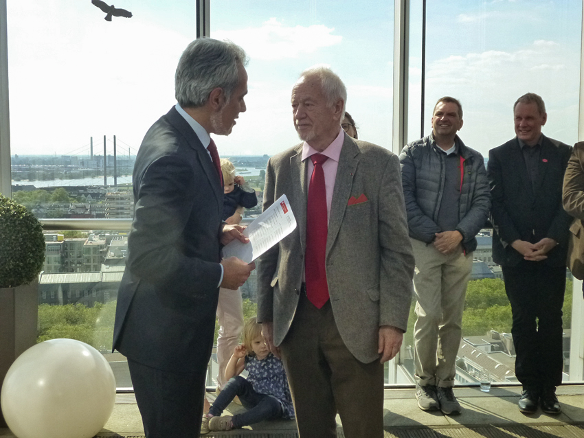 Im Hauptgebäude der Stadtsparkasse Düsseldorf durfte Hans Küster bei Sonnenschein und herrlichem Weitblick über Düsseldorf auf der 20. Etage am Dienstag, dem 14. Mai 2019 einen großzügigen Scheck für die Bürgerhilfe Gerresheim aus den Händen von Regionalmarktleiter Lütfü Sine für die Kindereinkleidung entgegennehmen.