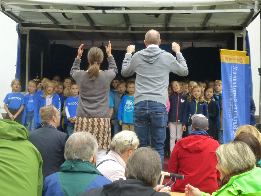 Als um 10.30 Uhr die SingPause mit Kindern der Grundschulen "Unter den Eichen" und Knittkuhl die Menschen begeisterte, war der Platz gefüllt. Weiteres Highlight war anschließend das Radschlägerturnier, an dem 63 Mädchen und 3 Jungen teilnahmen. Wie in den vergangenen Jahren auch hatten dazu Helfer der Filiale der Deutschen Bank auf der Benderstraße eigens Rollstuhlfahrer des Heye-Hauses in ihrer Freizeit rechtzeitig zum Radschlägerturnier gefahren und mitbetreut. Das Turnier fand in mehreren Gängen statt. Die vierköpfige Jury, darunter Alde Baas Rolf Lenz und Exkarnevalsprinz Dr. Udo Heinrich, hatten es bei der Vielzahl guter Räder nicht leicht. Moderator Robby Stürtzer moderierte das Turnier souverän. Alle teilnehmenden Kinder erhielten eine Medaille.