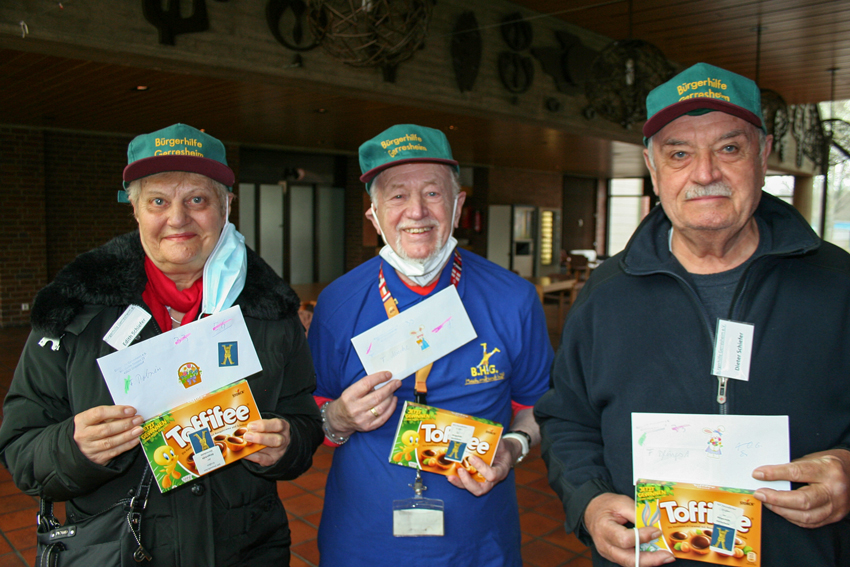 Mitglieder und Aktive der Bürgerhilfe Gerresheim bedankten sich am Montag und am Mittwoch bei den Bewohnern des ehemaligen DRK-Seniorenzentrums Lochbachweg in Gerresheim mit einem österlichen Gruß und vielen Schachteln Pralinen für die langjährige Unterstützung und die vielen gemeinsamen Karnevalsfeiern. Hans Küster, Chef der Bürgerhilfe, erklärte hierzu. "Unsere Überraschungsaktion war ein voller Erfolg. Die Bewohner haben sich riesig über unsere Geste gefreut."