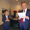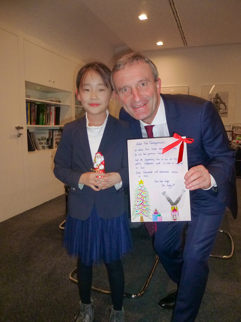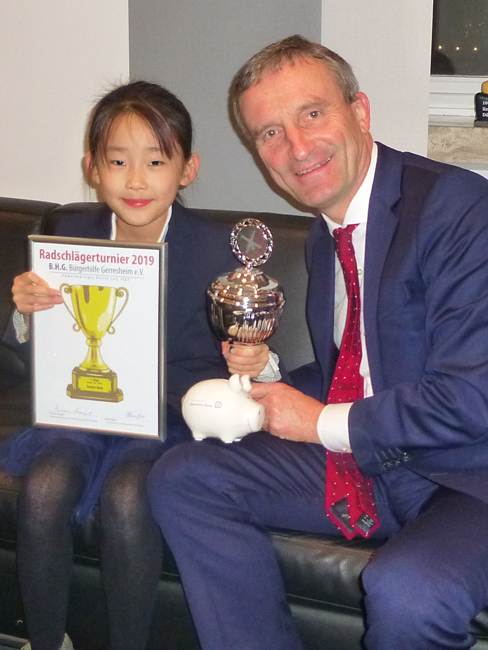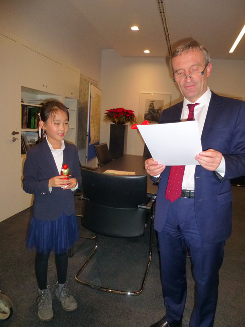Da Seoyu Jang, die Siegerin des Radschlägerturniers der Bürgerhilfe Gerresheim für Kinder bis 9 Jahre, bei der Ehrung Ende Oktober auf Heimaturlaub war, lud sie unser Oberbürgermeister Thomas Geisel am Nikolaustag, dem 6.12.2019 in sein Büro ins Düsseldorfer Rathaus ein, um die Ehrung nachzuholen, eine nette Geste und keine Selbstverständlichkeit. Seoyu, die mit Eltern, Geschwistern und einer Freundin gekommen war, bedankte sich dafür beim Oberbürgermeister mit einem selbst gestalteten Din A4 Blatt, er im Gegenzug mit einem Nikolaus. Nach Überreichung des Pokals, der Urkunde und einem gefüllten Sparschwein von der Deutschen Bank und anderer Präsente unterhielt sich unser Oberbürgermeister mit Seoyu und ihren Eltern unter Anwesenheit von Hans Küster, dem 1. Vorsitzenden der Bürgerhilfe Gerresheim, über eine halbe Stunde lang in entspannter Atmosphäre auch über private Dinge. Dabei wurden zum Schluss Erinnerungsfotos für das Album gemacht.
