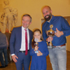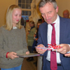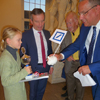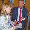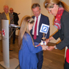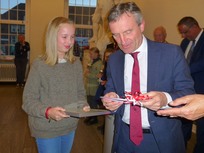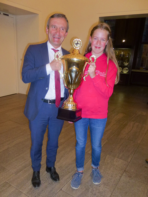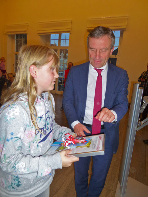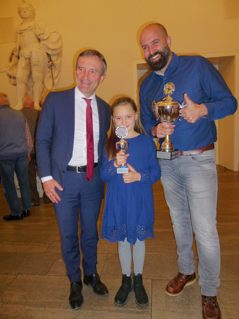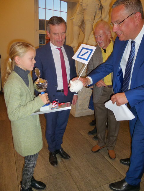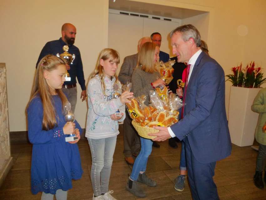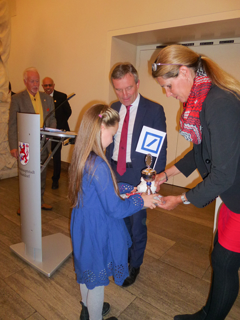 Bei der anschließenden Siegerehrung überreichte unser Oberbürgermeister den drei erst platzierten siegreichen Kindern jeweils einzeln den Pokal mit der eingerahmten Urkunde und ein Präsent von der Stadt. Dazu überreichte Carsten Krämer von der Filiale der Deutschen Bank, Benderstraße, jedem der siegreichen Kinder jeweils ein Sparschwein, indem sich Geld befand, mit einem Fähnchen und einer Tasche, damit die Kinder auch ihre Sachen nach Hause schaffen konnten, die sie aber direkt an ihre Eltern weitergaben, damit natürlich das obligatorische Foto gemacht werden konnte.