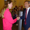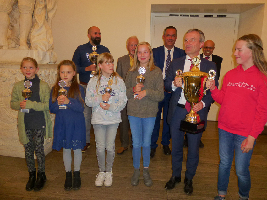 Seoyu Jang, Siegerin bei den Jüngeren Kindern, bekommt ihren Pokal später von Thomas Geisel überreicht, da sie auf Heimaturlaub ist. Den großen Wanderpokal für die beste Radschlägerin, denn es waren alles Mädchen, erhielt Marieke Dörner und den Wanderpokal für die Schule mit den meisten teilgenommenen Kindern nahm Schulleiter Marcel Köttendorf von der katholischen Grundschule "Unter den Eichen" aus den Händen von Oberbürgermeister Thomas Geisel entgegen. Neben vielen Einzelfotos durfte natürlich das Gruppenfoto mit Oberbürgermeister nicht fehlen