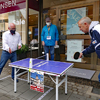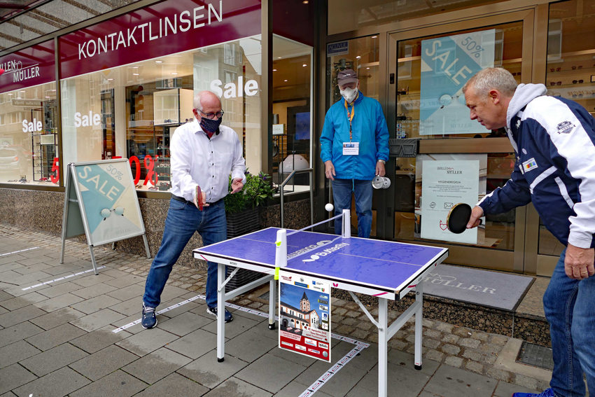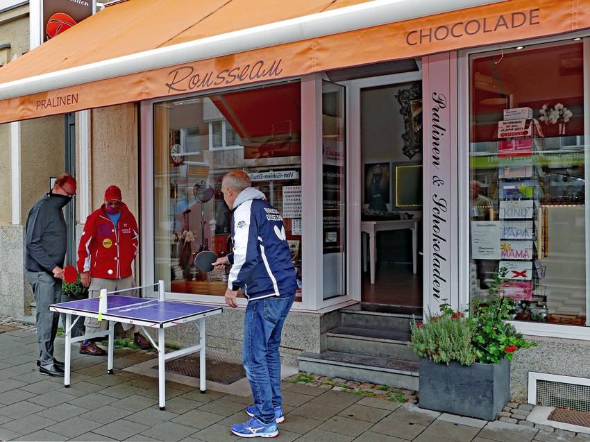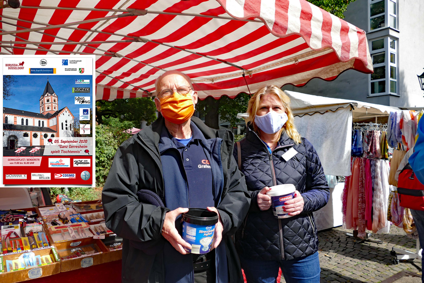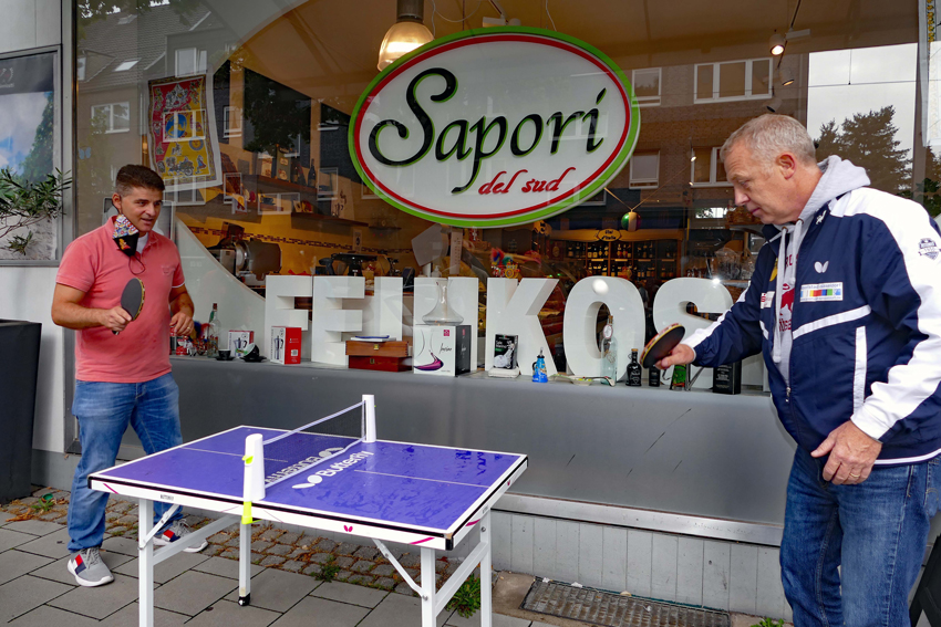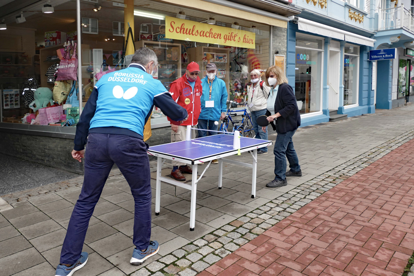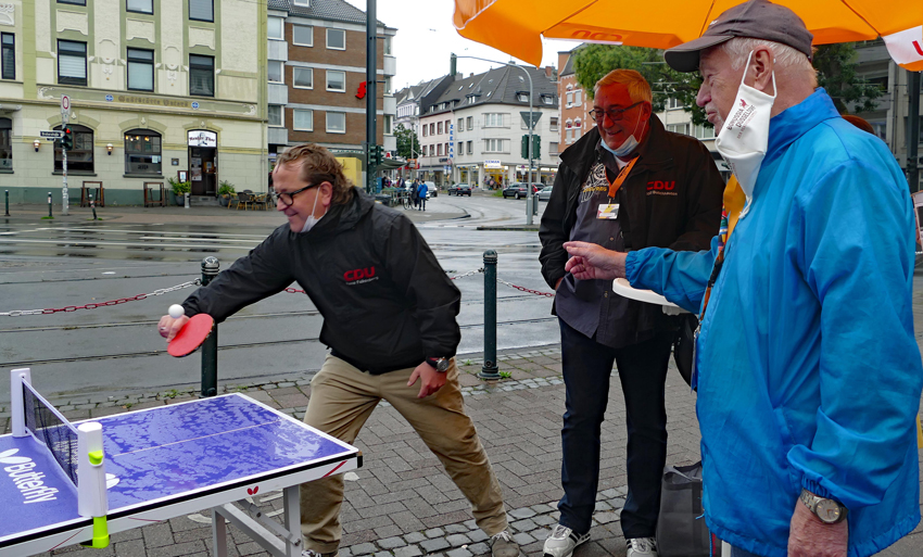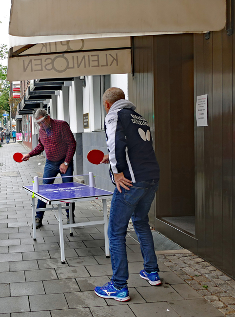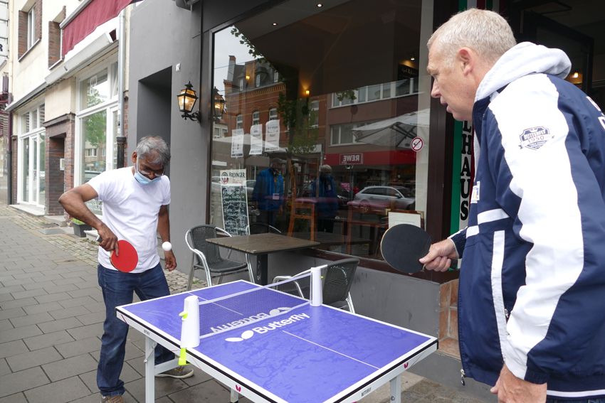 Am Samstag, dem 5. September 2020 sah man zwischen Benderstraße und Gerricusplatz sozusagen ganz Gerresheim Tischtennis spielen. An Stelle des Straßenfestes hatten die Bürgerhilfe Gerresheim und der Tischtennisbundesligist Borussia Düsseldorf auf Grund von Corona aus der Not eine Tugend gemacht und diese Veranstaltung zwischen 11 Uhr und 16 Uhr ins Leben gerufen, um dabei auch für die sozialen Projekte der Bürgerhilfe Gerresheim Geld zu sammeln, das letztlich dem ganzen Stadtteil zu Gute kommt. Highlight war sicherlich die Möglichkeit, mit Bundesligaspielern wie Timo Boll von Borussia Düsseldorf zu spielen, die Ballgeschwindigkeit zu messen oder gegen den Computer auf dem Gerricusplatz zu spielen.